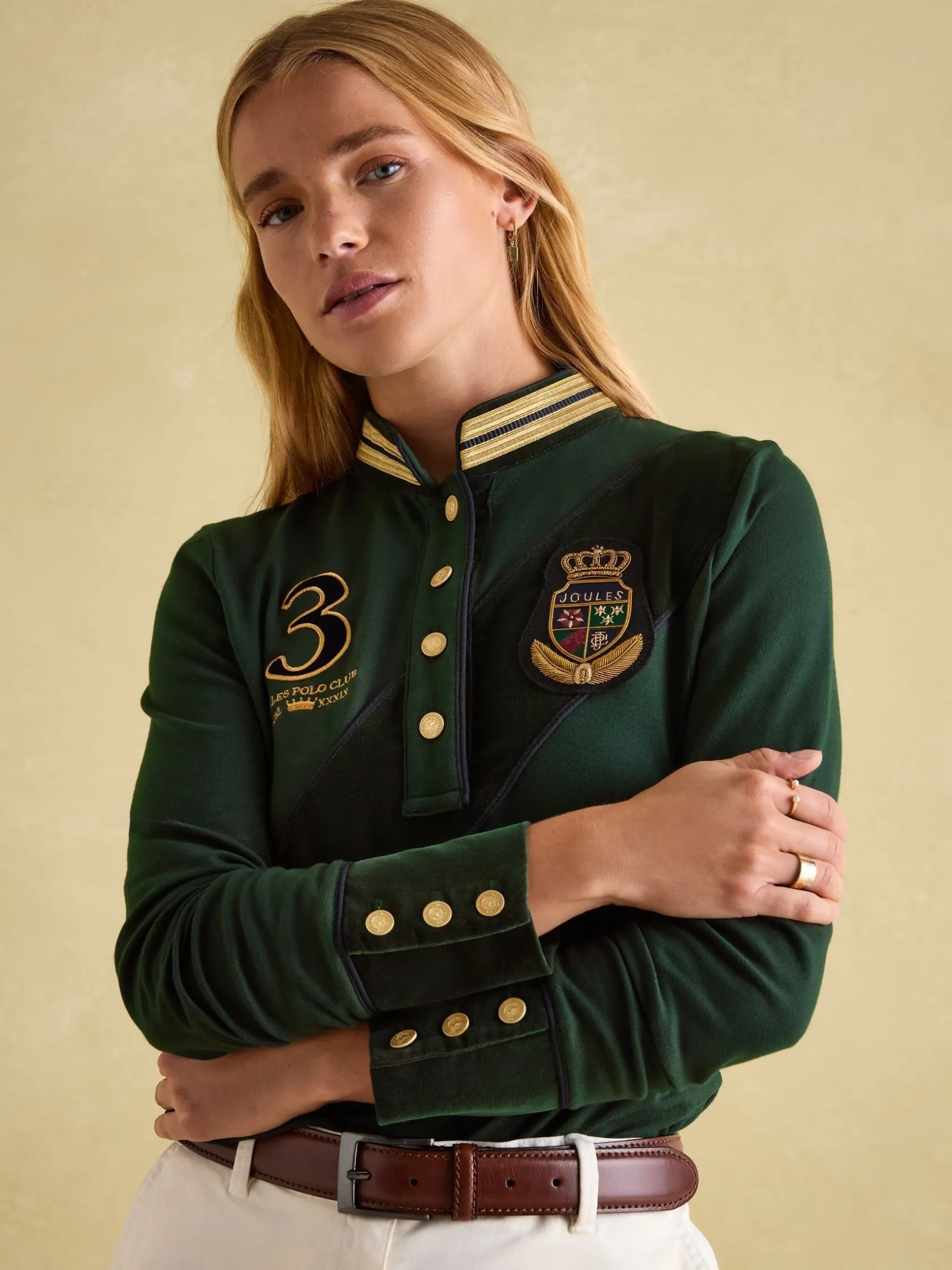 True equestrian elegance, elevated. This is possibly the most premium polo shirt we’ve ever designed. In a flattering shape and crafted from quality cotton that includes a little stretch for a lot of comfort, it has a velvet sash with piping either side running diagonally across the front, a stunning velvet Nehru collar complete with velvet and gold tape, velvet cuffs with functional button detail and more. The real star of the show is the stunning badge – an artwork in its own right that features an intricate badge nestled into a laurel wreath – the craft and quality that this bead and metal work badge demonstrates is extraordinary.nnVelvet Nehru collar with piping and gold tapenButton fasteningnVelvet sash with gold pipingnVelvet button cuffsnSide ventsnNo.3 detailnIntricate badgenEmbroidery to back neck