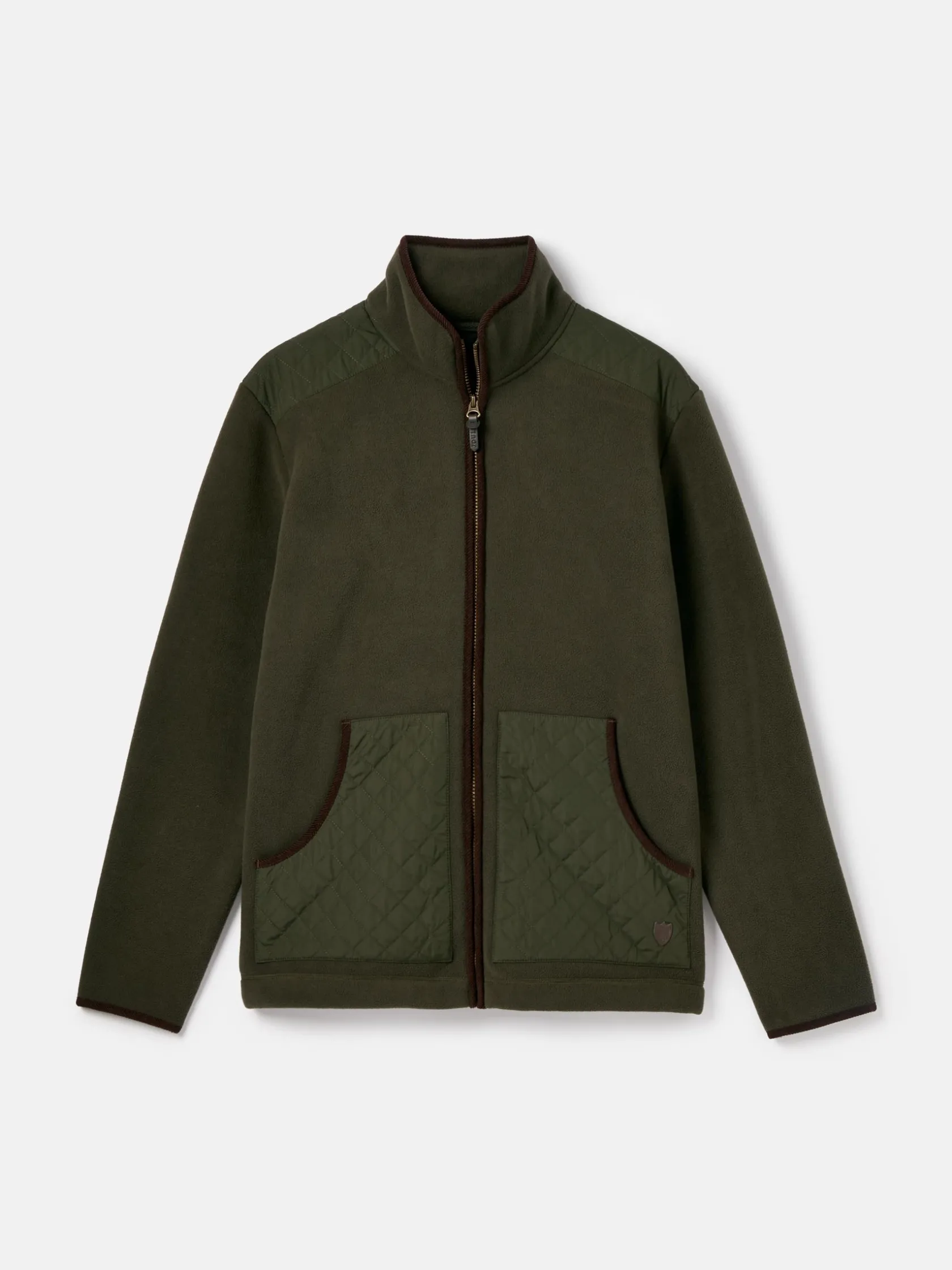 Carrying a traditional countryside look, the Greenfield fleece jacket is a rugged style designed for outdoor rambles and the like. The fleece fabric is contrasted with woven diamond quilting to the front and back yoke and pockets. It has a zip fastening with faux leather zip pull, and cord binding to the cuffs, collar and pockets and can be adjusted at the hem via the internal bungee cord toggles. Branded details can be seen on the left pocket and under the collar. For a classic country look, layer it over checked shirts, and jeans and throw in a pair of wellies for good measure. Discover the matching Greenfield gilet. Borg fleece fabric. Woven diamond quilted detail to the front and back yoke. Two front pockets with diamond quilting. Cord binding. Adjustable hem via internal bungee cord toggles. Zip fastening with faux leather zip pull. Joules branded badge to the left pocket (as worn). Joules embroidery under the collar. Internal pocket. Length: 74cm (based on a UK size: Medium).