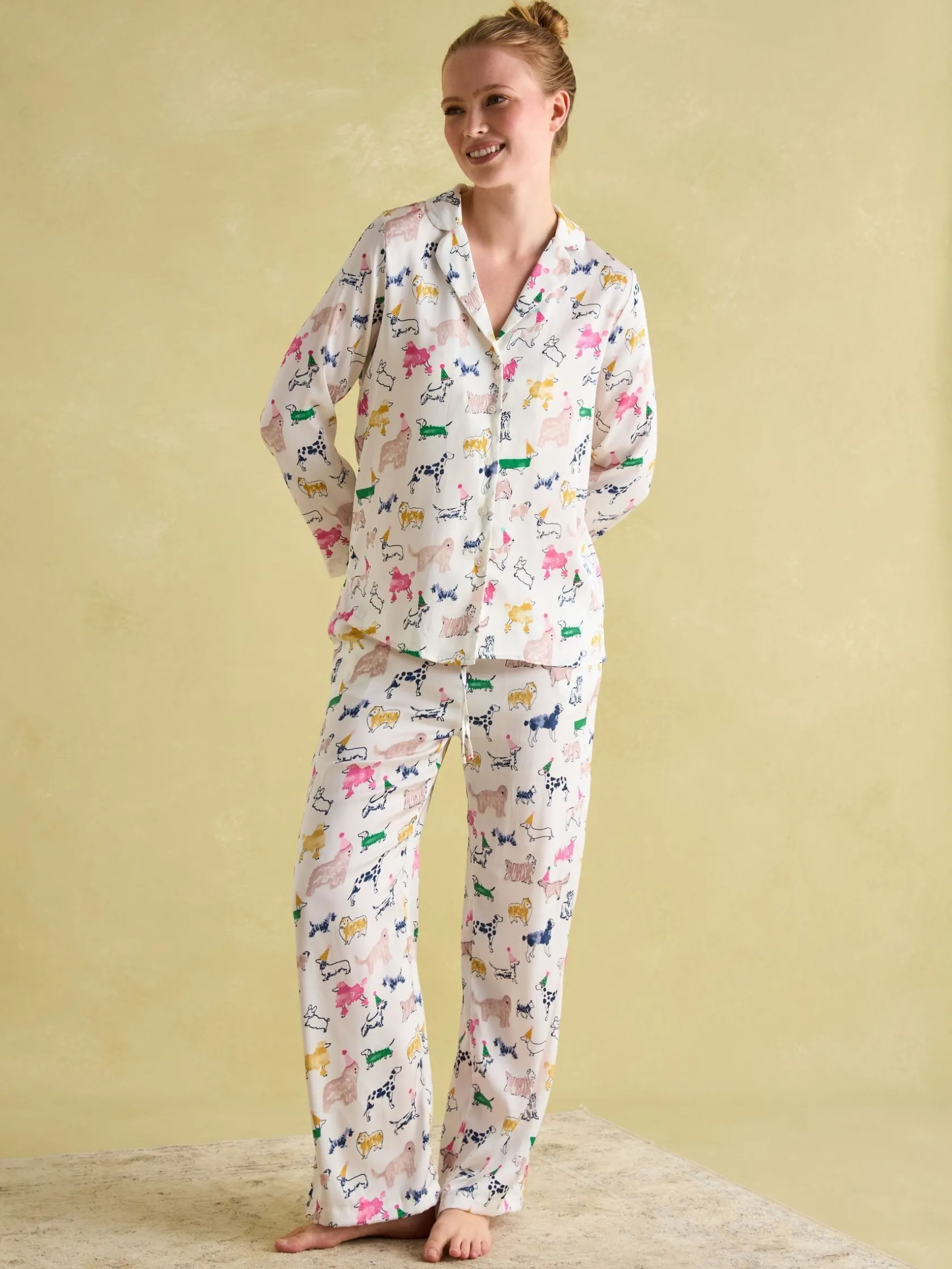 These green pyjamas are packed with personality, perfect for those who love life in the slow lane. The lightweight, soft satin fabric is adorned with an eye-catching print. The button fastening to the top and elasticated waistband to the button – along with handy pockets – are practical touches, whilst the pleating and trim details elevate this set further. Satin pyjama set. Top and bottoms. Button fastening on top. Elasticated waist on bottoms. Pockets.