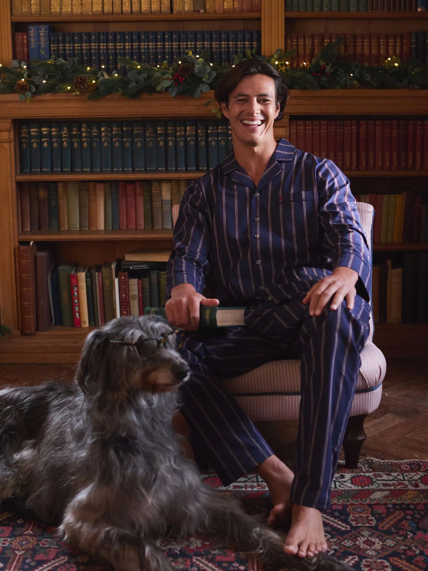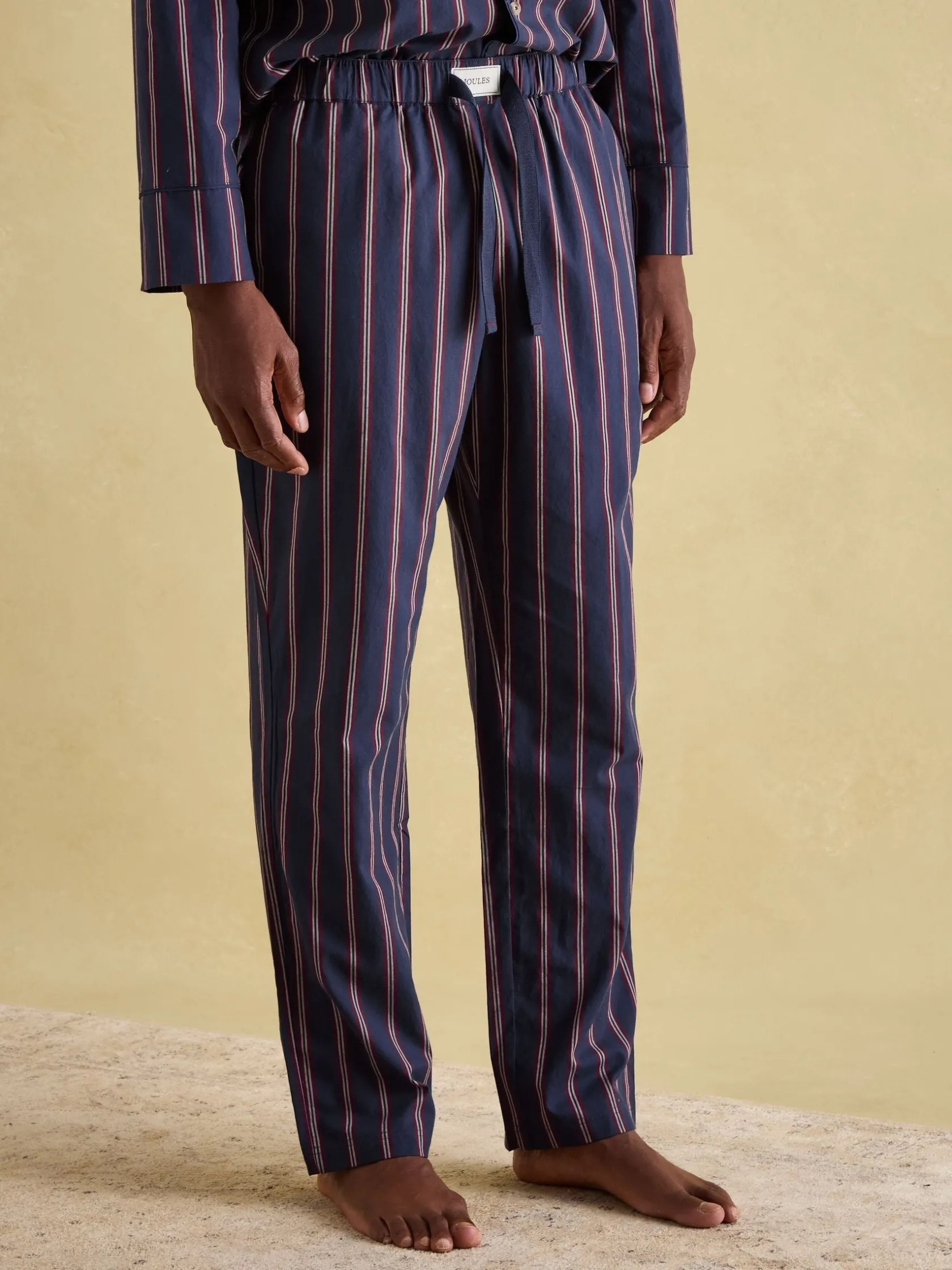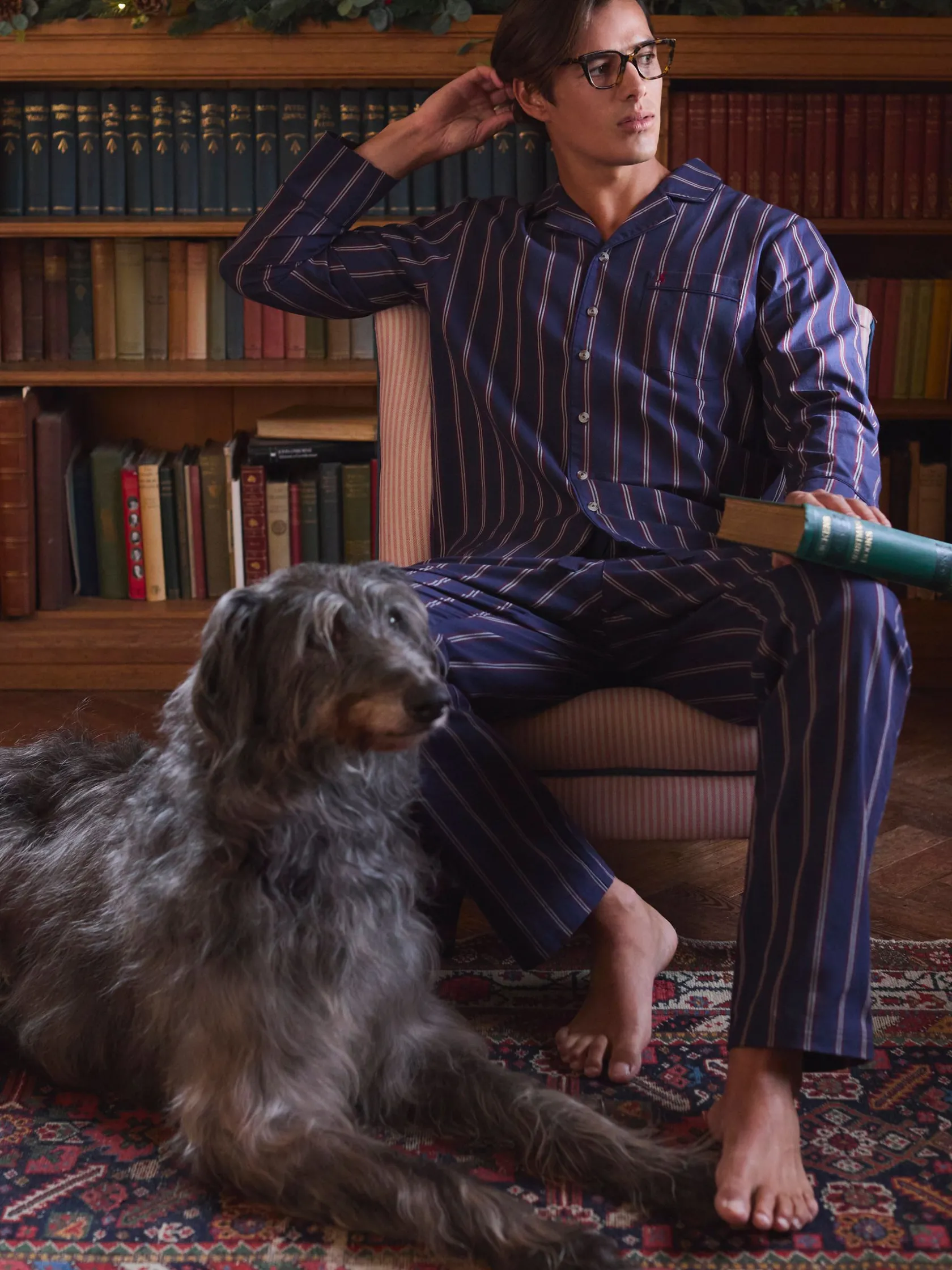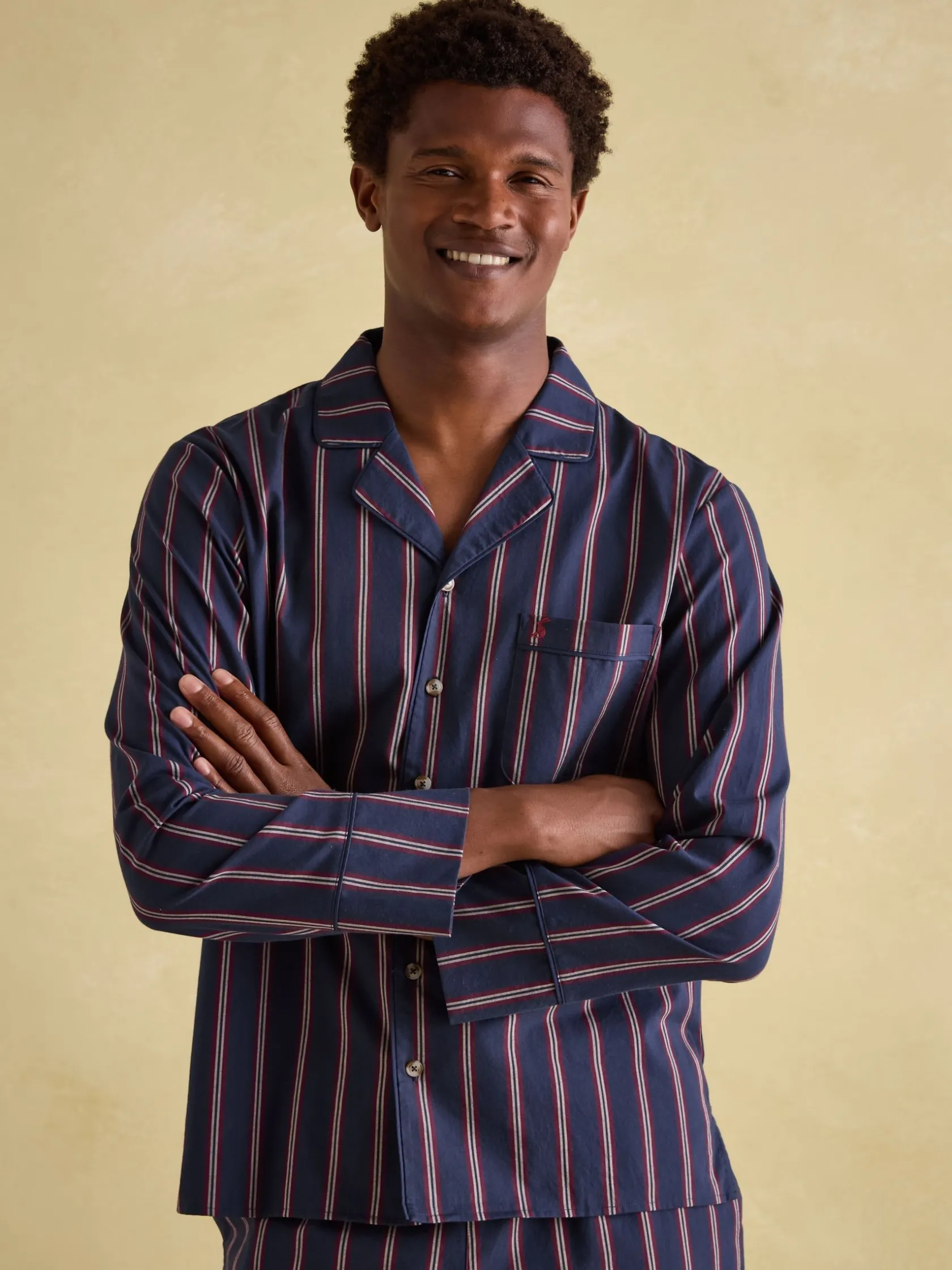 Designed for downtime, this set of men’s pyjamas will have him kicking back in style and comfort. They’re crafted from soft 100% cotton and feature a classic pinstripe design for a truly gentrified look. The button down shirt has a lapel collar, a single patch pocket to the chest and piped trims, while the matching bottoms have an elasticated waist with drawstring ties and a branded tab to the front. Side pockets complete the set and add to its laid-back appeal. 100% cotton. Pyjama set. Button down shirt. Single chest pocket. Collar. Piped trims. Elasticated waist with drawstring ties. Branded tab to the front waistband. Striped.
