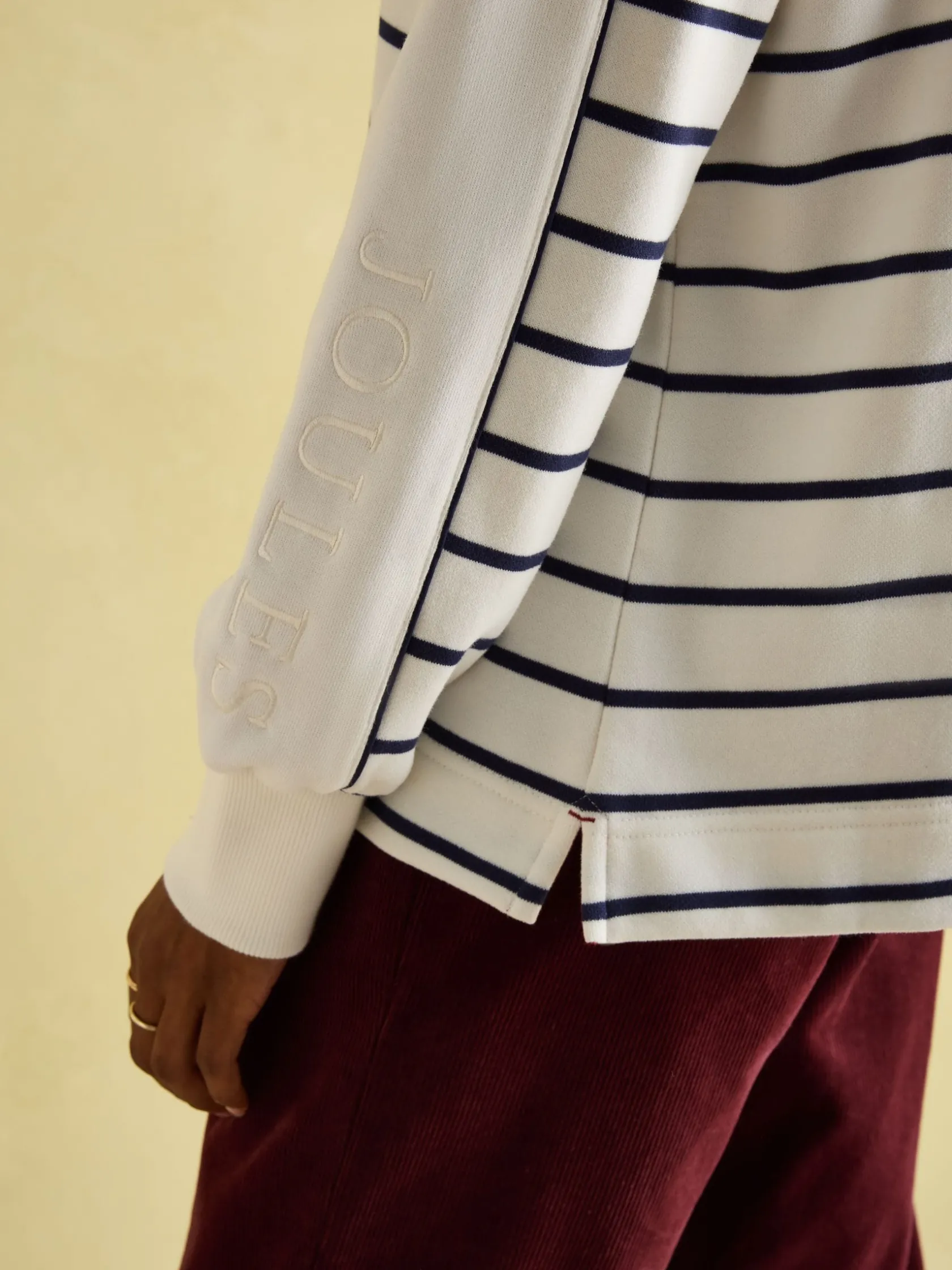 Elevated for the new season, our Southwold sweatshirt was inspired by coastal strolls (as the name suggests!). It’s crafted from hardwearing jersey, and has a funnel neck and button placket, with a contrasting stripe to the inside neck and a Joules emblem to the front as an unmistakable mark of quality. The striking stripe pattern continues onto half of the sleeves for an eye-catchingly stylish look. Jersey sweatshirt. Stripe design. Funnel neck with button placket. Joules embroidery to back neck and sleeve