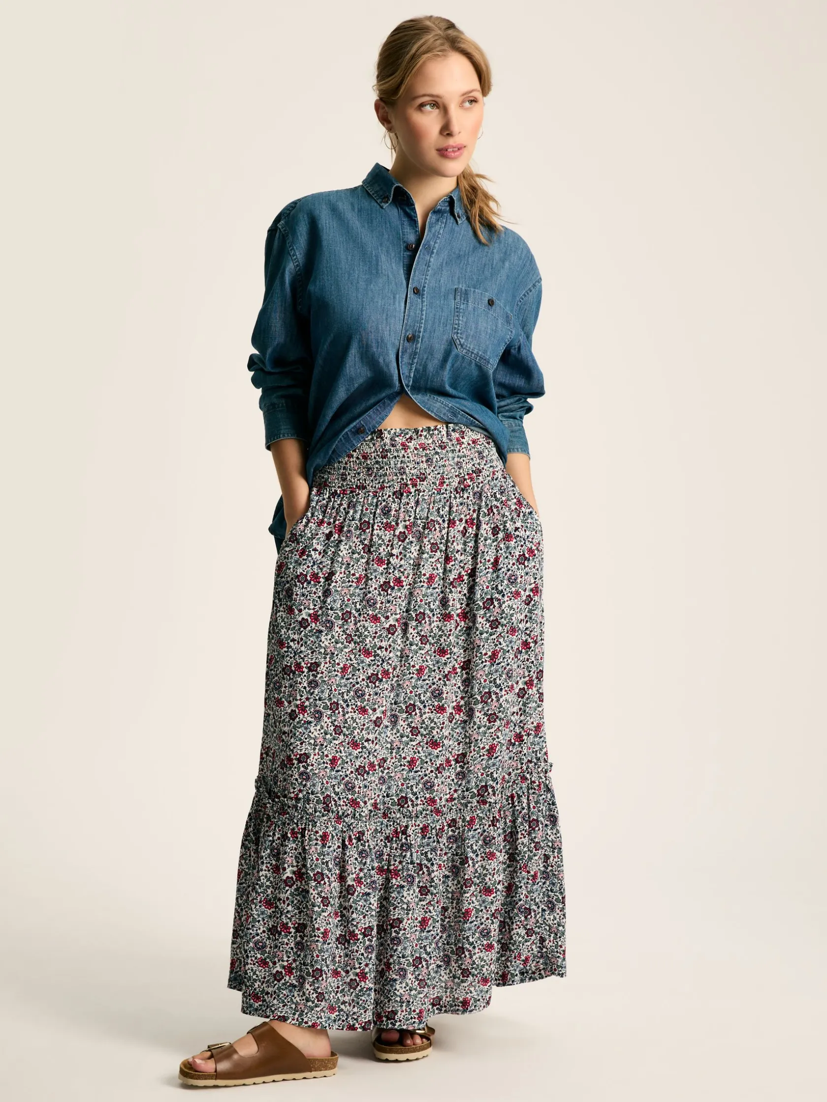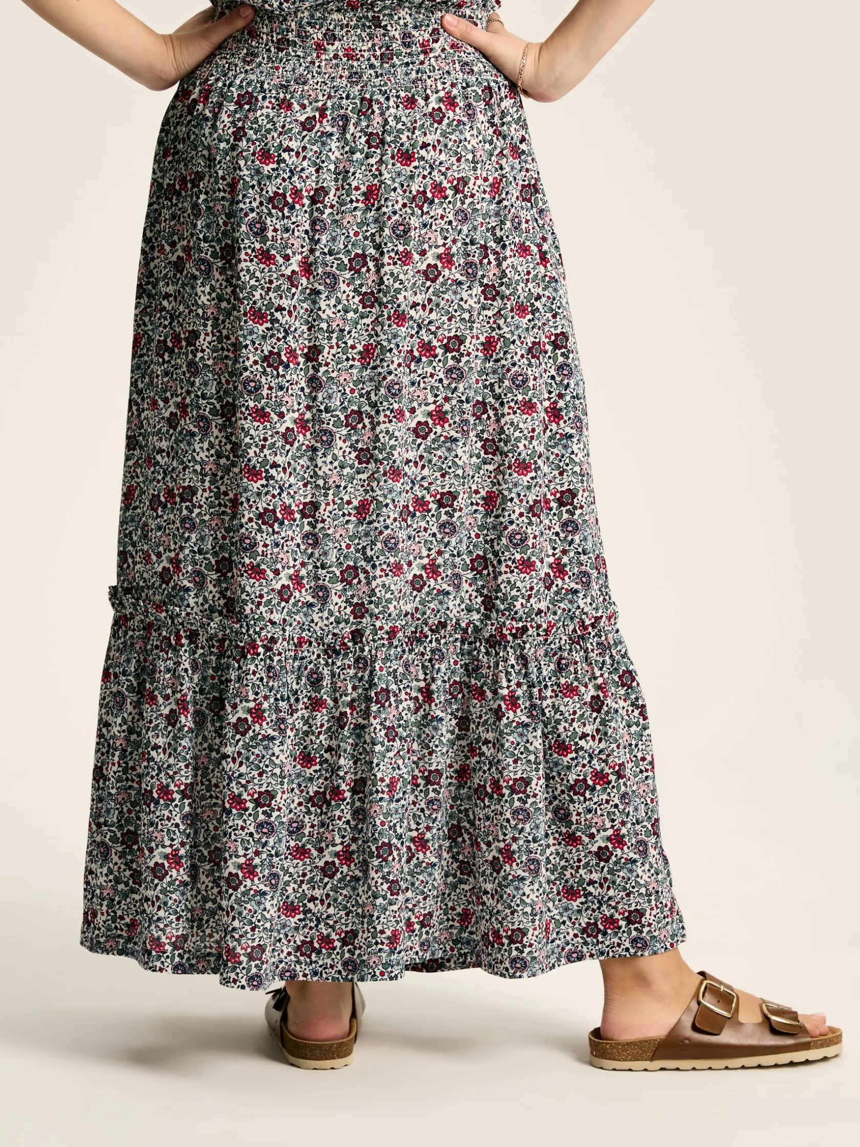 Make room in your wardrobe for the Verity skirt. This spring and summer staple is crafted from a light viscose fabric that falls to a midaxi length making it a dream to pair with pumps and sandals. For a flattering fit it has an elasticated shirred waistband which gives it a cinched effect, while the tiered skirt adds movement through the piece. It’s finished with a hand-drawn print that is sure to elevate your look. Midaxi length. Elasticated shirred waistband. Tiered skirt. Hand-drawn print. Matching co-ord blouse available separately.