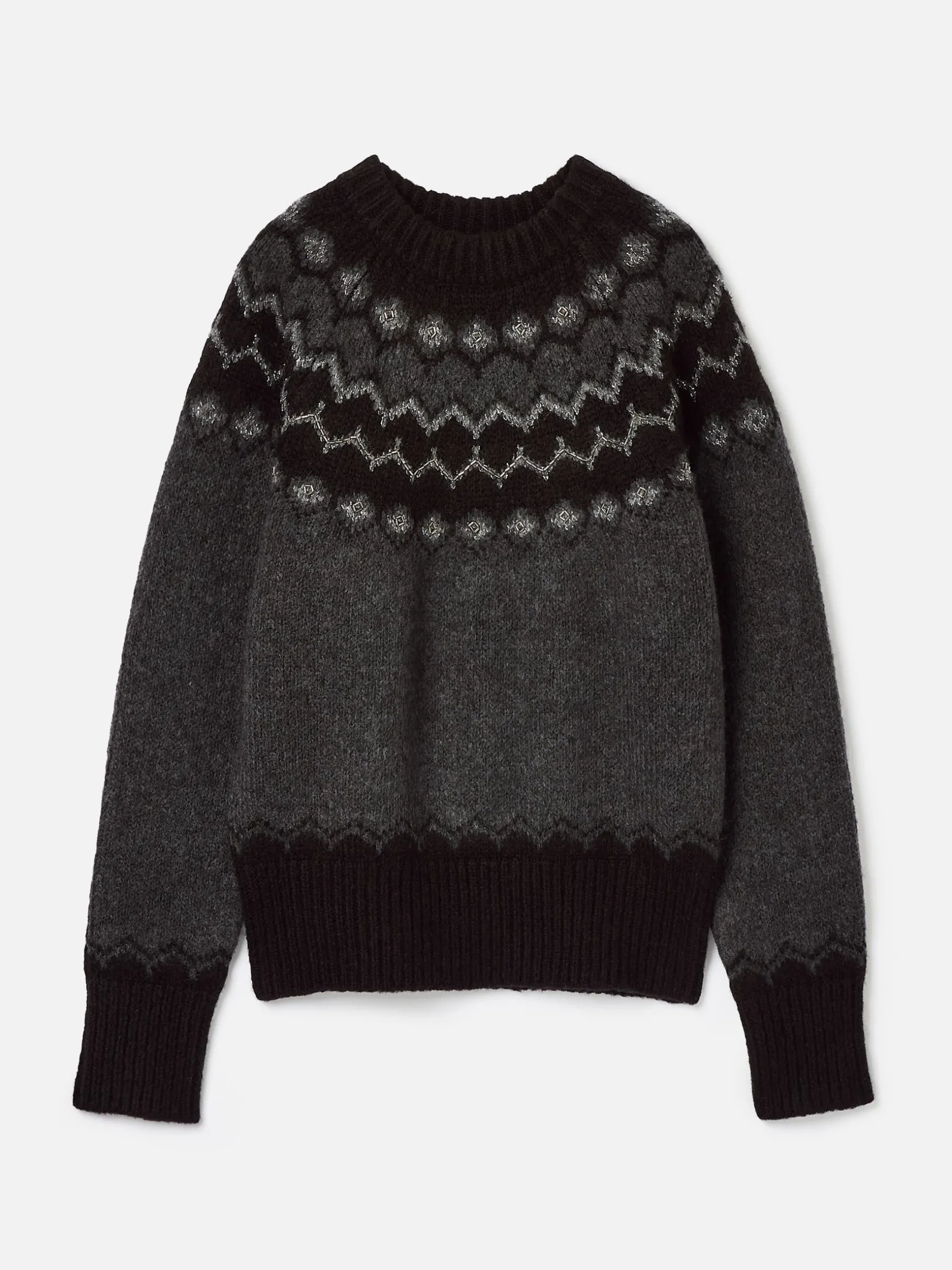 This is a classic Fair Isle with an elevated twist for the festive season and beyond. Featuring metallic thread woven throughout, it’s the perfect casual party piece – think daytime festivities or New Year’s Eve at the local. It’s made from a soft wool blend, has a ribbed round neck making it great for layering and is finished with a deep ribbed hem and cuffs. The Fair Isle pattern adorns the front and back yoke in a palette of charcoal grey, black and gold, with the cuffs finished with a flourish of Fair Isle too. Wool blend. Deep ribbed cuffs. Ribbed round neck. Fair Isle pattern to the front and back yoke. Fair Isle detail to the cuffs. Metallic thread for a touch of sparkle.