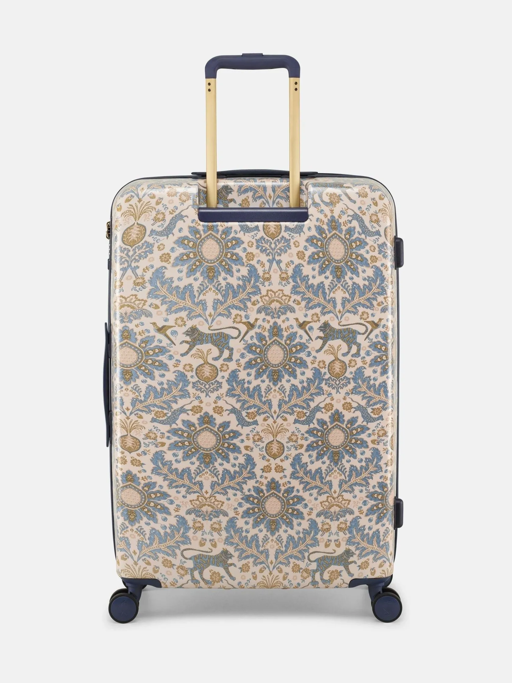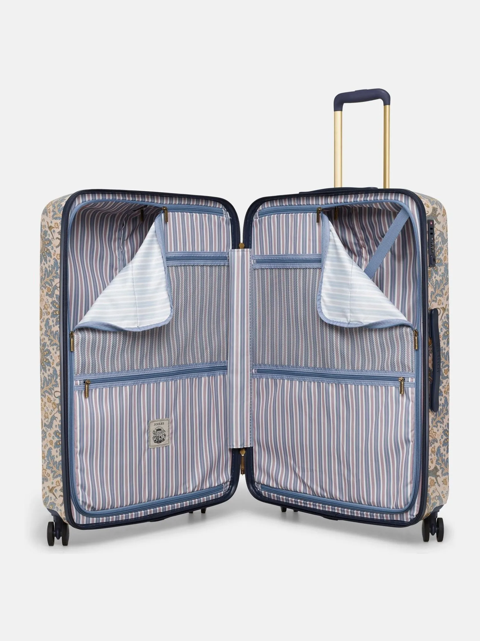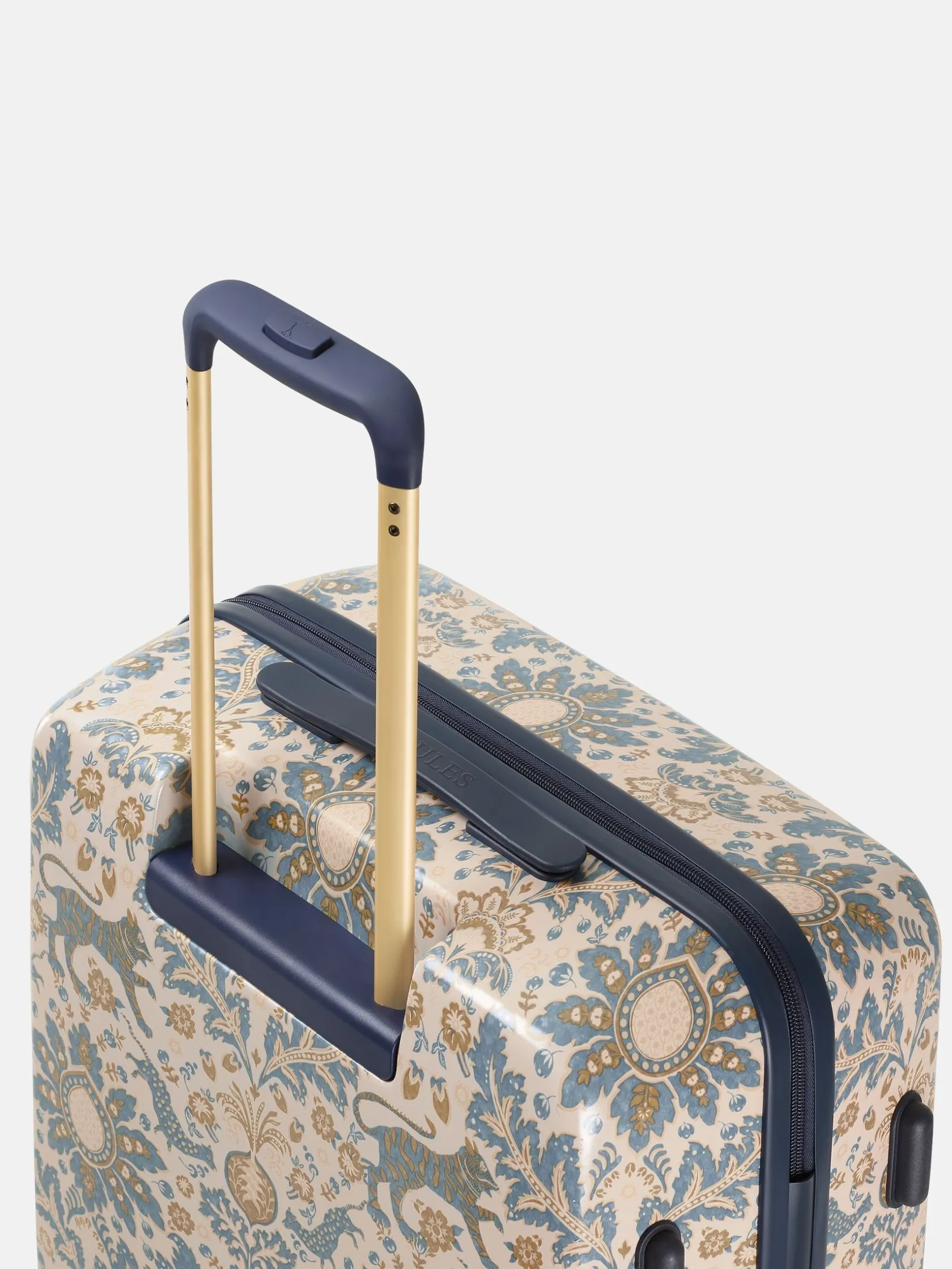 Travel in style with the Joules large-sized suitcase – perfect for long-haul trips to far-flung destinations, or for combining the whole family’s holiday outfits into one case. Its hard shell outer is lightweight, durable and adorned with an elegant damask print which has been hand-drawn by the Joules print team for a truly distinctive look. Its four spinner-wheel design ensures 360° movement and the telescopic trolley handle further enhances its ease of use. To give you full peace of mind when travelling overseas, the TSA-approved lock will ensure all your belongings remain safe. Inside is a haven if your style of packing is of the organised kind. It features two main zipped compartments, one of which has a compression strap for keeping things in place, as well as four additional zipped pockets for smaller items. It’s finished with a striped lining for another unique-to-Joules touch. Part of a four-part luggage collection, you can pick up the matching vanity case, cabin and medium suitcase too. 75.5 x 49.5 x 28cm. Hard shell outer. Lightweight. Fixed carry handle. Telescopic trolley handle with branded push button. Four spinner wheel design for maneuverability. Striped lining. Integrated TSA Lock for secure travel. Two main zipped compartments, with additional zipped pockets for organised packing. Compression straps to one side for compact packing