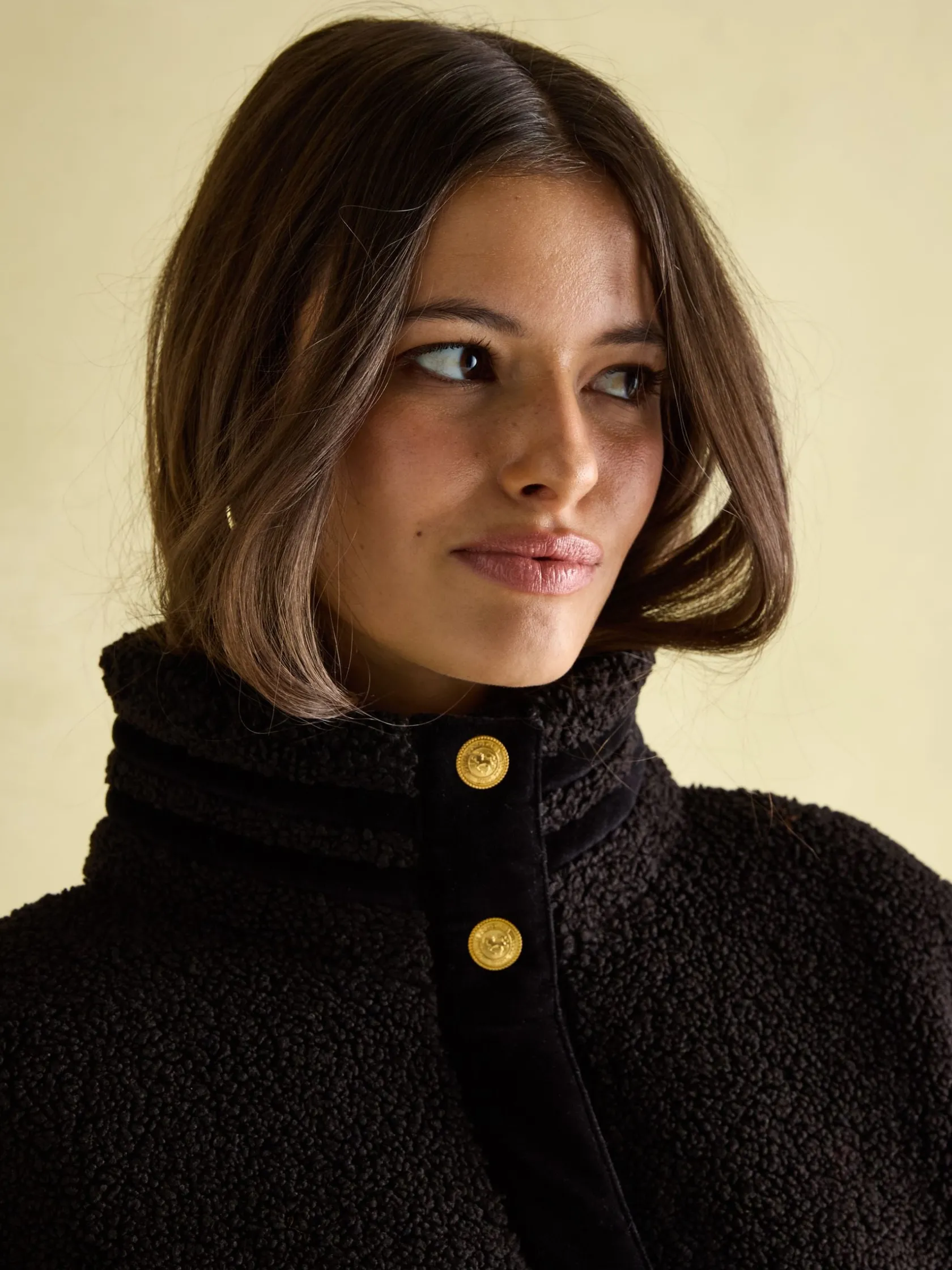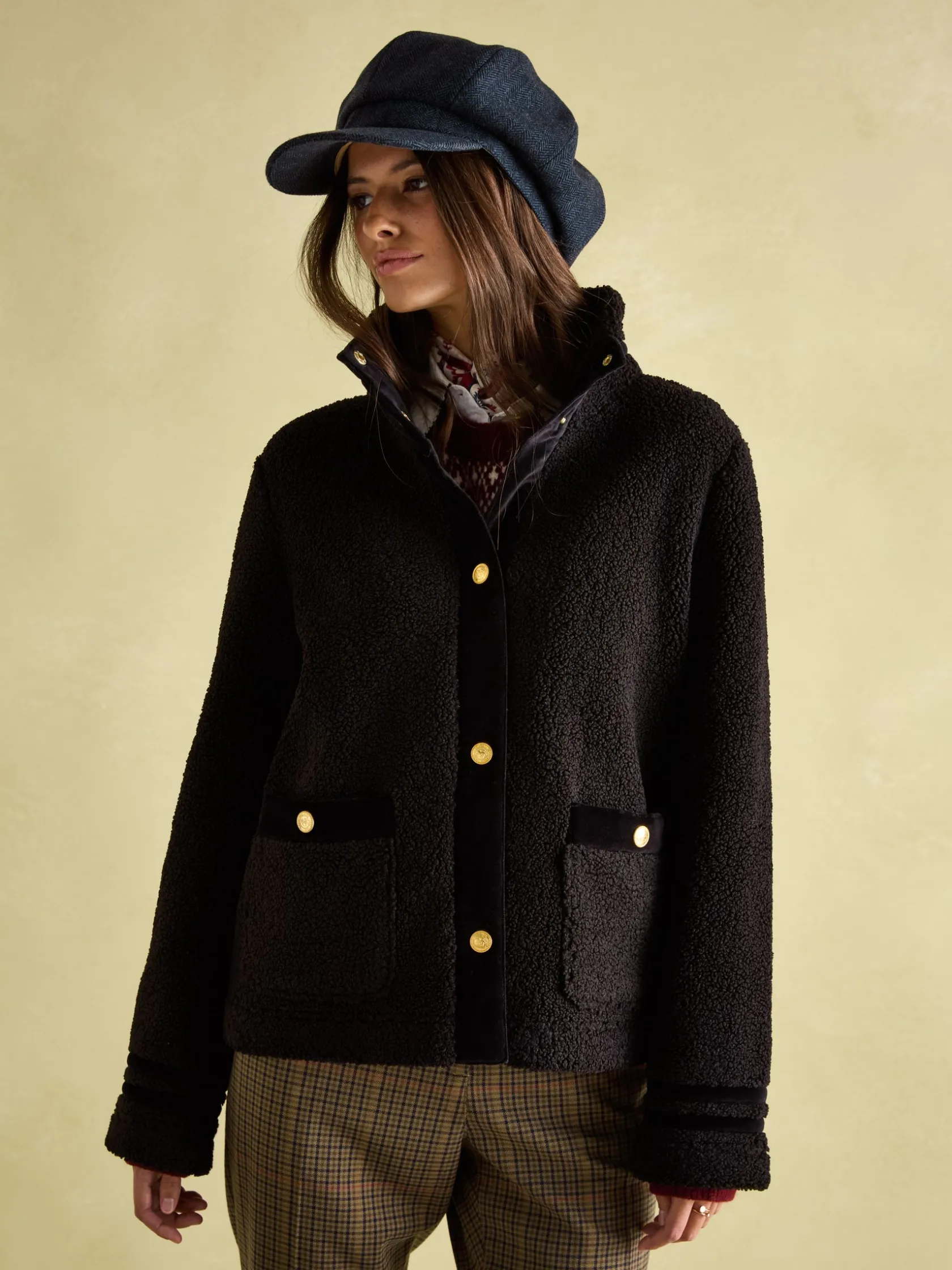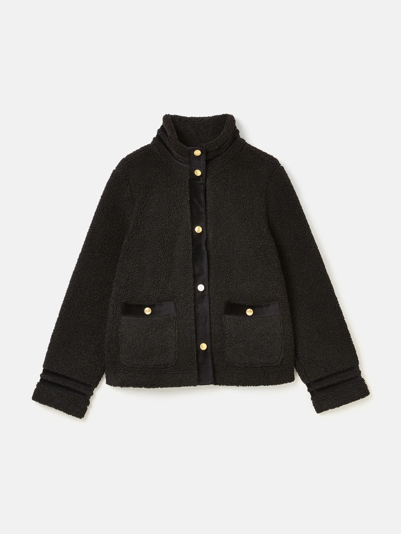 A great piece for the move into autumn, the Fleur fleece jacket will give your outfits a final layer of style. It has a boxy fit with an upstanding funnel neck for a distinctive look and its high shine gold poppers add an elevated element. Velvet trims to the neck, placket, cuffs and pocket trim makes it truly something special. Layer over anything from t-shirts and tops to knitwear for an easy everyday look you’ll love wearing. Borg fleece. Funnel neck. Boxy fit. High shine gold popper fastening. Two front pockets with popper fastenings. Velvet trim detailing to the neck, cuffs, placket and pockets.