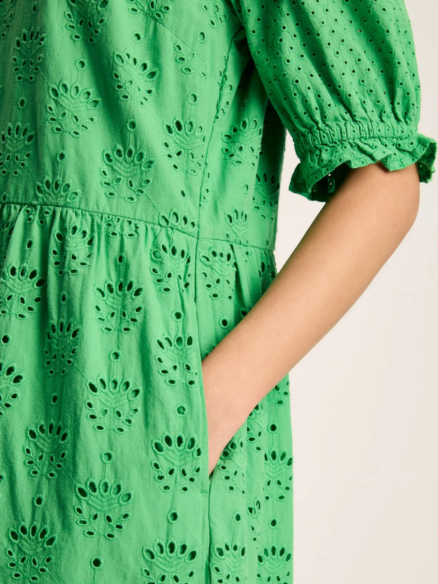 It’s not summer without light and beautiful broderie dresses. And Isabel is without doubt a warm weather must-have with its knee length, tiered skirt and crisp cotton fabric. The sleeves sit at elbow length with gathered shoulders for volume and pretty frilled cuffs. It has a round neck with a keyhole button fastening, pockets in the side seams and all over broderie cutwork. The body of the dress is lined while the sleeves remain unlined. Pair with pumps or sandals and breeze through the season in style. Cotton. Knee length. A-line shape. Tiered skirt. Elbow-length sleeves with gathered shoulders. Round neck with keyhole button fastening. Broderie detailing. Lined body. Pockets in the side seam.