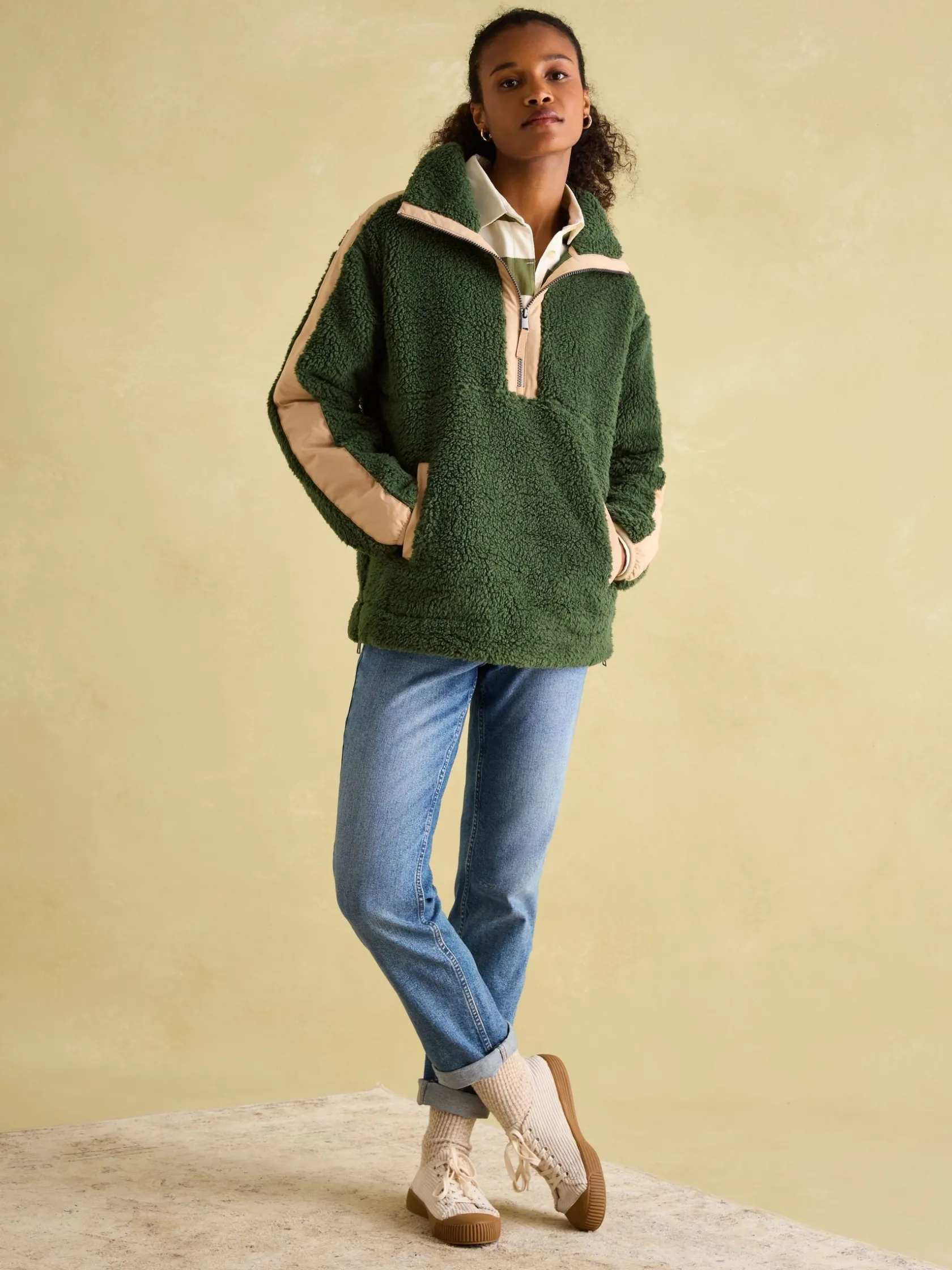 Do you remember the Tilly fleece? It was the style from last season that made cold days something to look forward to and nights even more joyful. Well, it’s back and like an old friend, it’s bringing familiar comfort (with a few inevitable changes made along the way). The cloud-like borg fleece fabric was adored by all, so of course that has stayed but it is now complemented by woven panels to the sleeves, pockets and zip placket for a sporty, ‘athleisure’ edge. The contemporary oversized fit, quarter zip fastening and zipped side vents allow you the room to build layers beneath it. And as for the Joules detail to the back neck, well that serves as a nice reminder of your favourite brand. Borg fleece. Relaxed fit. A bestselling style. Dropped shoulders. Half zip fastening. Woven panels to the sleeves, pockets and placket. Zipped side vents. Side pockets. Tonal Joules woven detail under the collar