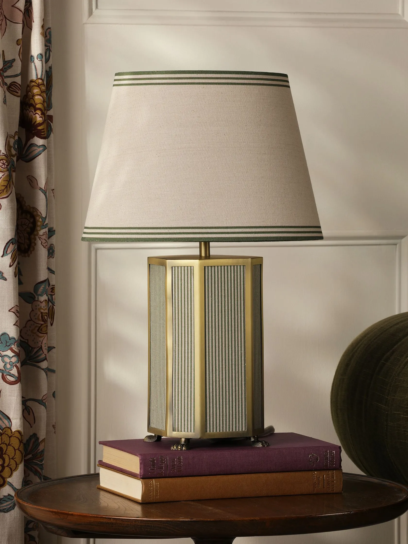 With the Helmingham table lamp creating a welcoming glow to the corners of your home, you’ll never want to turn the ‘big’ lights on again. This ornate piece combines a hexagonal matte antique brass base with striped fabric panelling and a claw foot for an opulent look that commands attention. The lamp shade has a classic tapered shape in a neutral colour and is finished with a coloured border that complements its base. Picture it nestled within a reading corner surrounded by your well-worn book collection.nnTable lampnHexagonal matte antique brass base with striped fabric panellingnClaw foot nTapered lamp shade with border nDi: 280mm x H.440mm