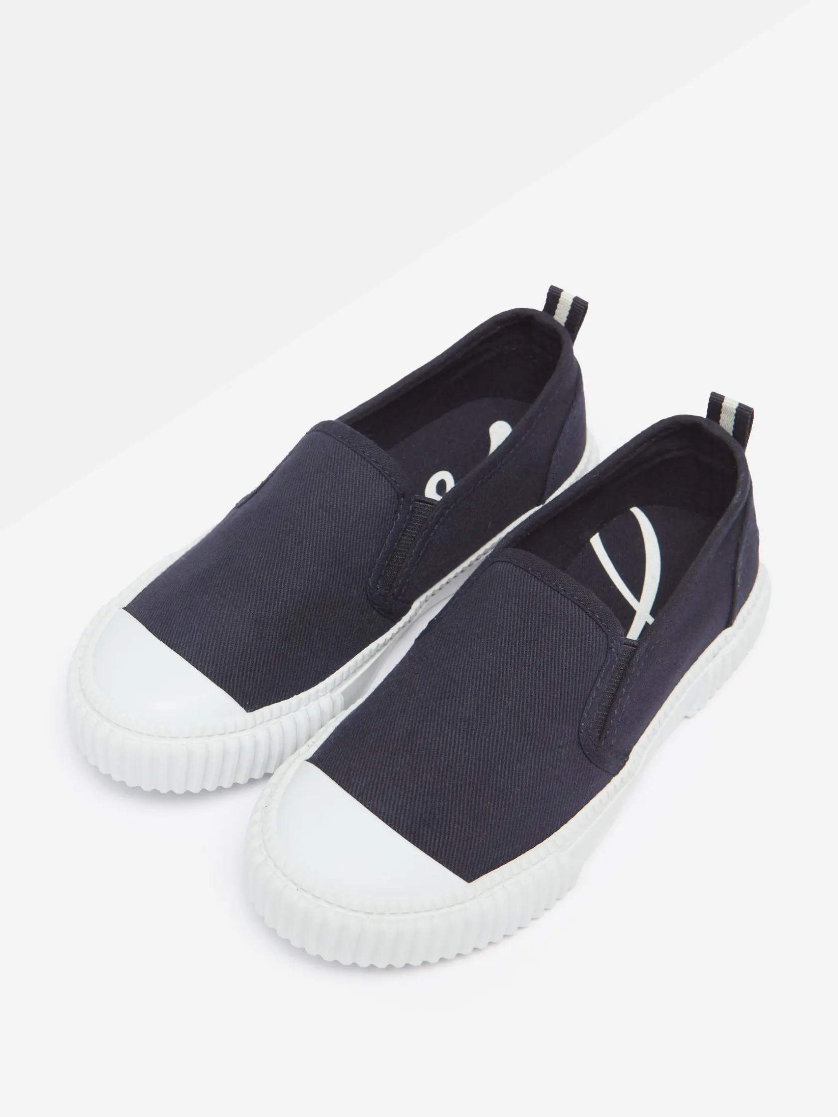 The perfect shoes for playtime, the Peasy plimsolls will be your little one’s favourite pair. The uppers are made from a twill cotton canvas and have a slip-on design aided by an elasticated gusset for easy on and off. A sturdy rubber outsole will ensure they can withstand all of their running around, while the ridged rubber foxing and toe bumper give them a classic look. Twill cotton canvas. Rubber outsole. Ridged, rubber foxing. Rubber toe bumper. Cotton lining. Webbing pull tab to the heel. Elasticated gusset for easy on and off