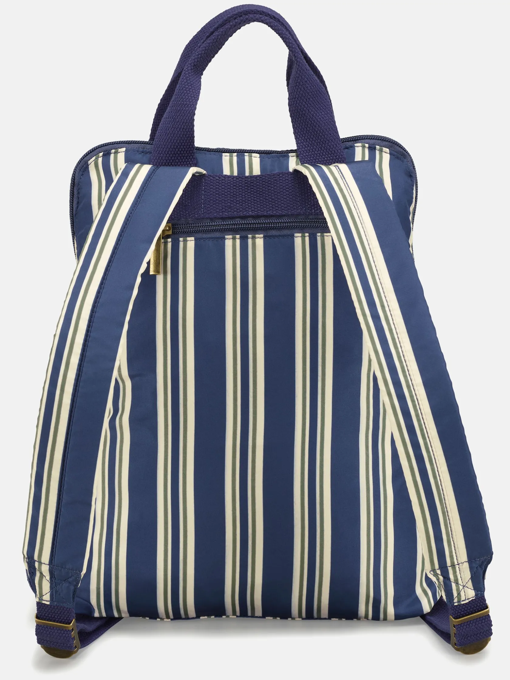 The Joules packable backpack is designed with both functionality and style in mind. It’s lightweight making it perfect for the day-to-day, but is roomy enough to hold essentials for a short trip away too (if you travel light). The striped design and ‘Sports Club’ emblem to the front gives it a preppy look while remaining timeless through the navy, green and cream colour palette. Its packable function means it won’t take up space when it’s unused and can go anywhere with you. The backpack features a main zipped compartment with an additional front pocket (which it packs away into) which are secured with zip fastenings. Two handles are fixed to the top of the bag with adjustable padded shoulder straps offering a more traditional way to wear it. Pick up the matching packable duffle bag for a complete look. 36 x 27 x 10cm. Packable function. Fixed carry handles to the top. Adjustable padded shoulder straps. Zipped main compartment. Zipped front pocket. Additional zipped back pocket. Joules Sports Club emblem to the front