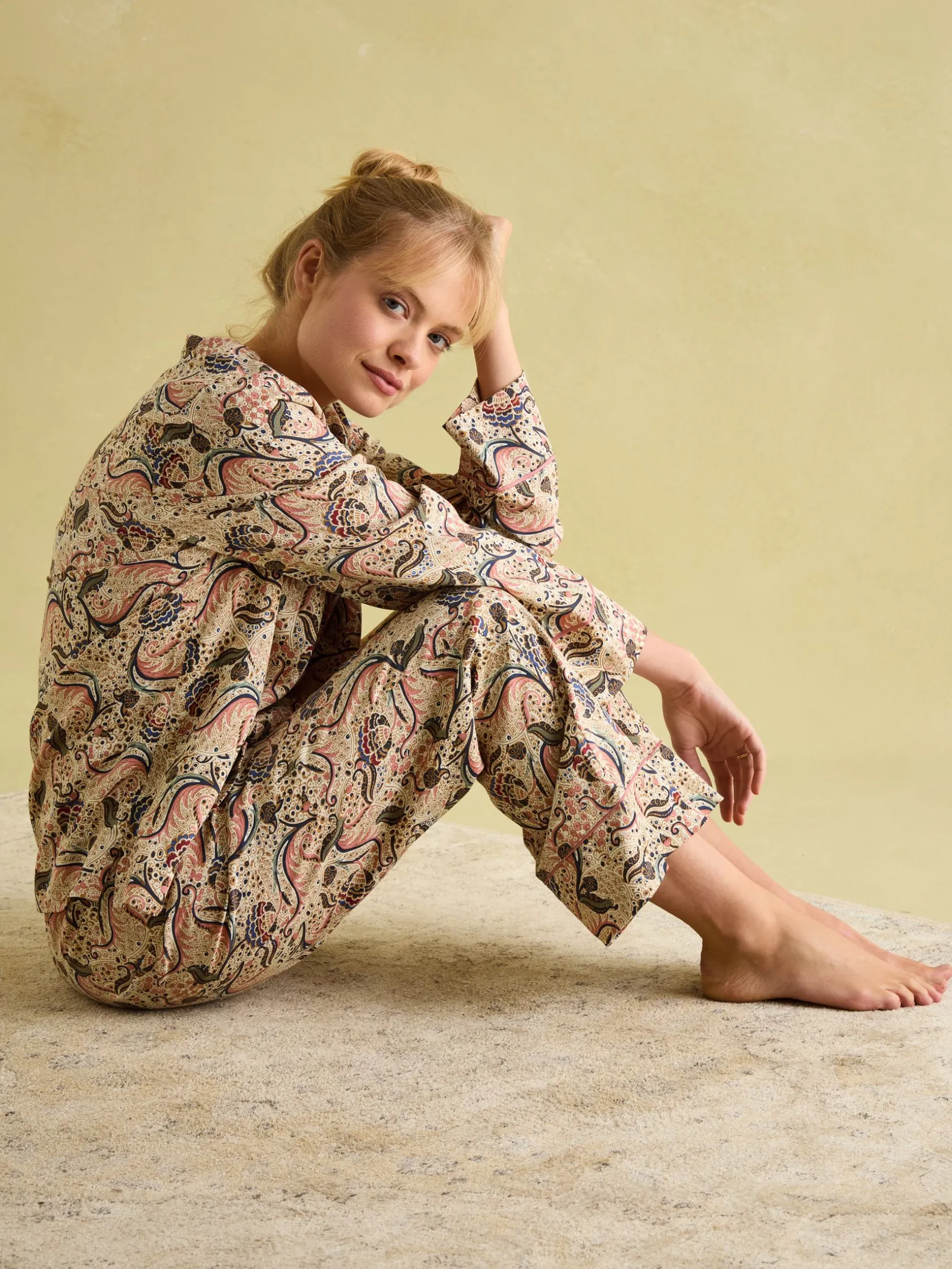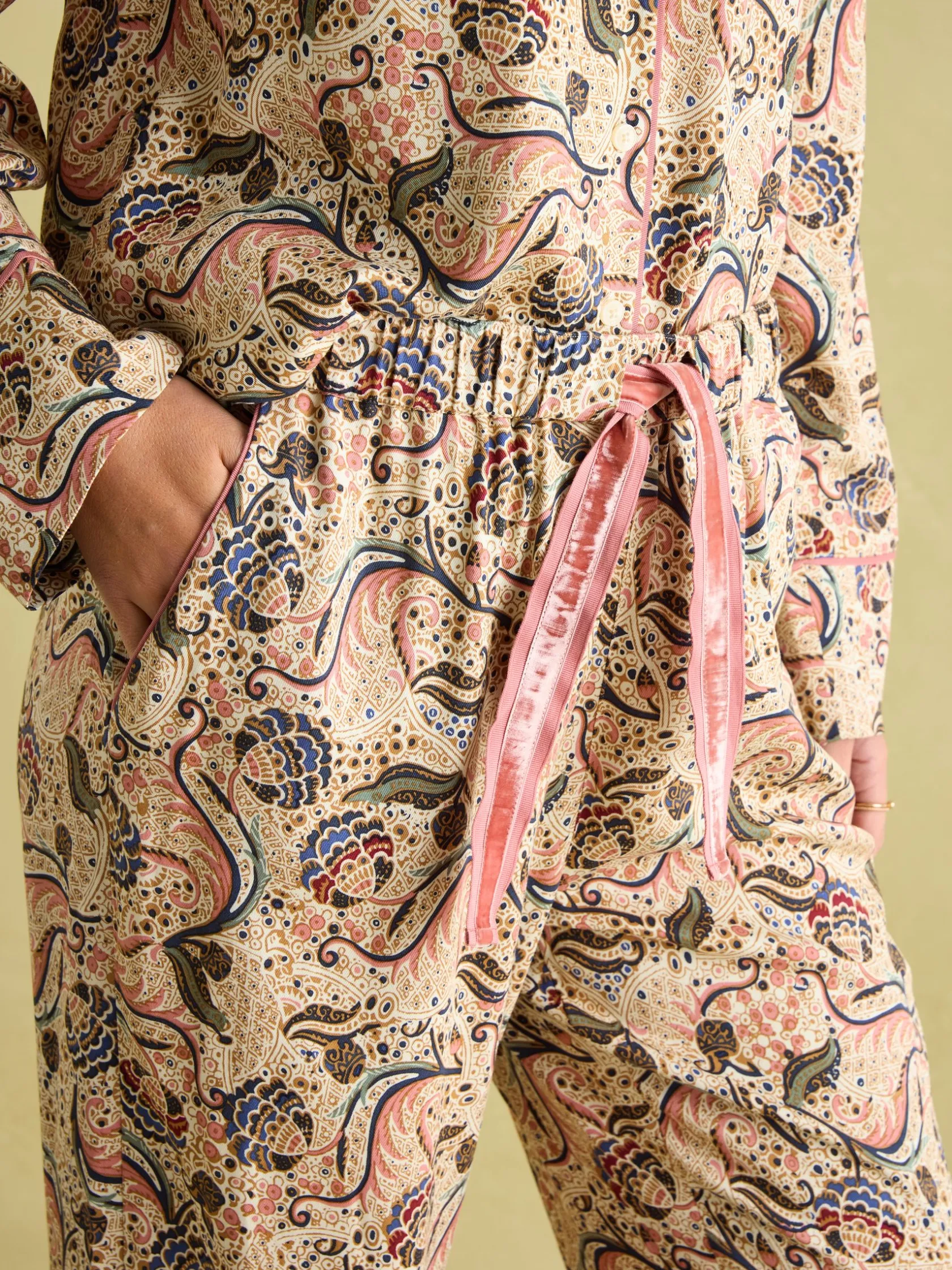 Drift off to dreamland with our Alma pyjama set. The set is crafted from lightweight and breathable viscose and comes with a long-sleeved button-up shirt, complete with a patch pocket and contrasting piped trims. The matching bottoms have a straight fit through the leg, an elasticated waist, luxurious velvet-topped drawcords and slanted side pockets. With a collection of heritage-inspired hand-drawn prints available, you’ll be truly spoilt for choice.nnViscosenLong sleevesnButton-down fasteningnPatch pocket to the chestnPiped trimsnVelvet topped drawcordsnElasticated waistnSlanted side pocketsnHeritage print