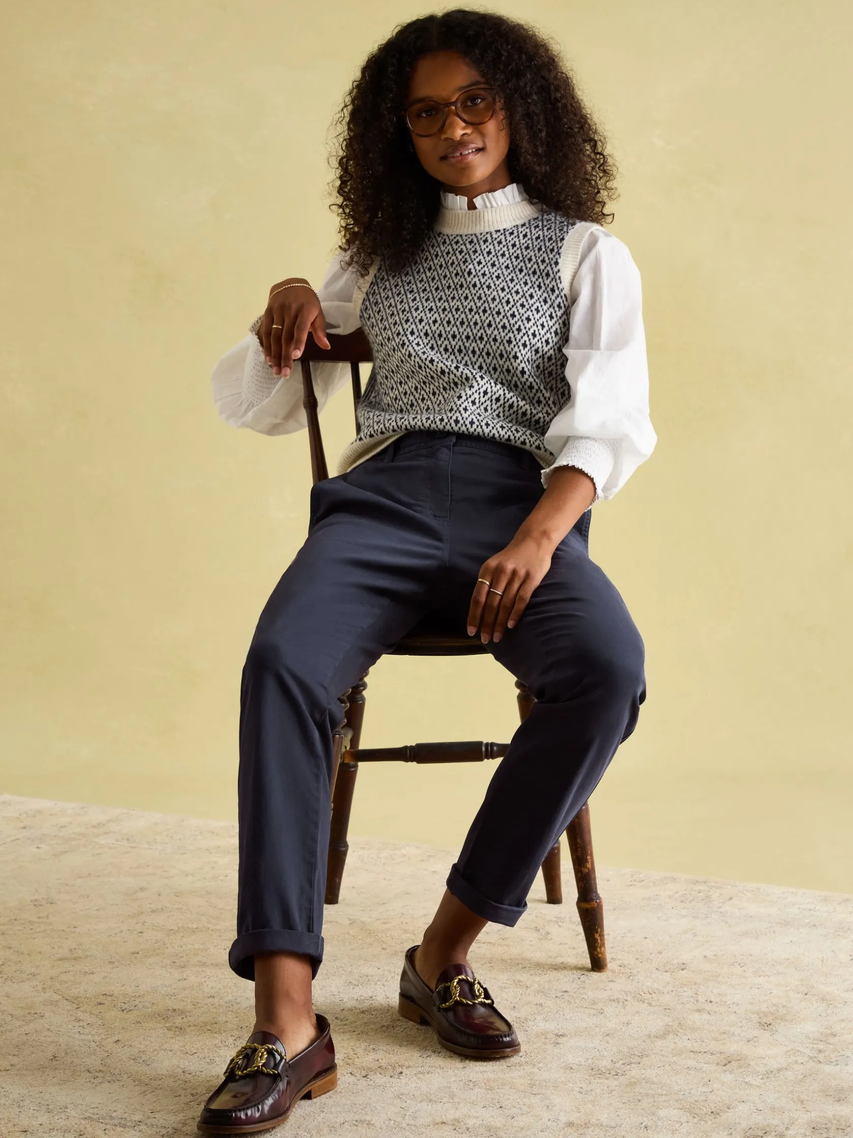 Combining comfort and style, a pair of chinos should hold a space in every woman’s wardrobe. For our take on this smart casual classic, we’ve added a flattering mid-rise waist, a slim fit through the leg and an elasticated band to the back waistband for a little added stretch. The fabric is a cotton blend and has been brushed back for a soft-hand feel. They fasten with a zip and faux horn button fastening and have two side pockets and an additional two welt pockets to the rear with matching faux horn buttons. A true love forever pair. Cotton blend. Mid-rise waist. Slim fit through the leg. Brushed fabric for a soft hand-feel. Elasticated waistband. Zip and button fastening with a single faux horn button. Belt loops. Side pockets. Back welt pockets with buttons.