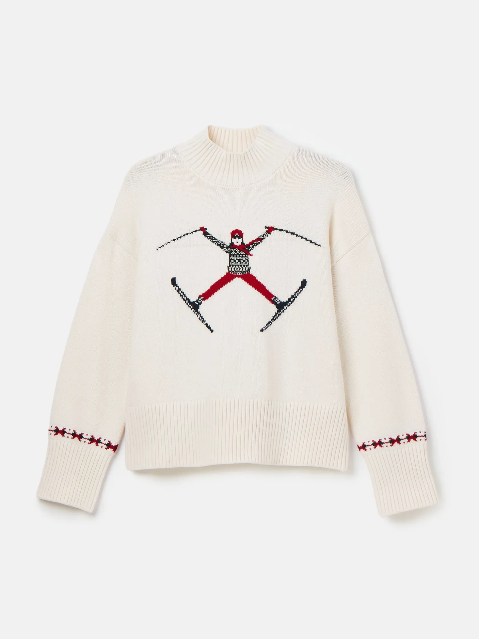 Inspired by the vintage ski graphics of yesteryear, the Abigail jumper nods to nostalgia while feeling contemporary through its relaxed fit. It feels as good as it looks with a soft cotton and wool blend, dropped shoulders, wide sleeves and a ribbed high neck. It’s finished with a deep ribbed hem and cuffs which this year include Fair Isle detail. This is just the thing to wear, whether you’re hitting the slopes (or après ski) for real, or exploring the snow blanketed hillsides closer to home.nnCotton and wool blendnRelaxed fitnDropped shouldersnHigh ribbed necknWide sleevesnDeep ribbed hem and cuffs (cuffs now include Fair Isle detail)nVintage-inspired skier intarsia