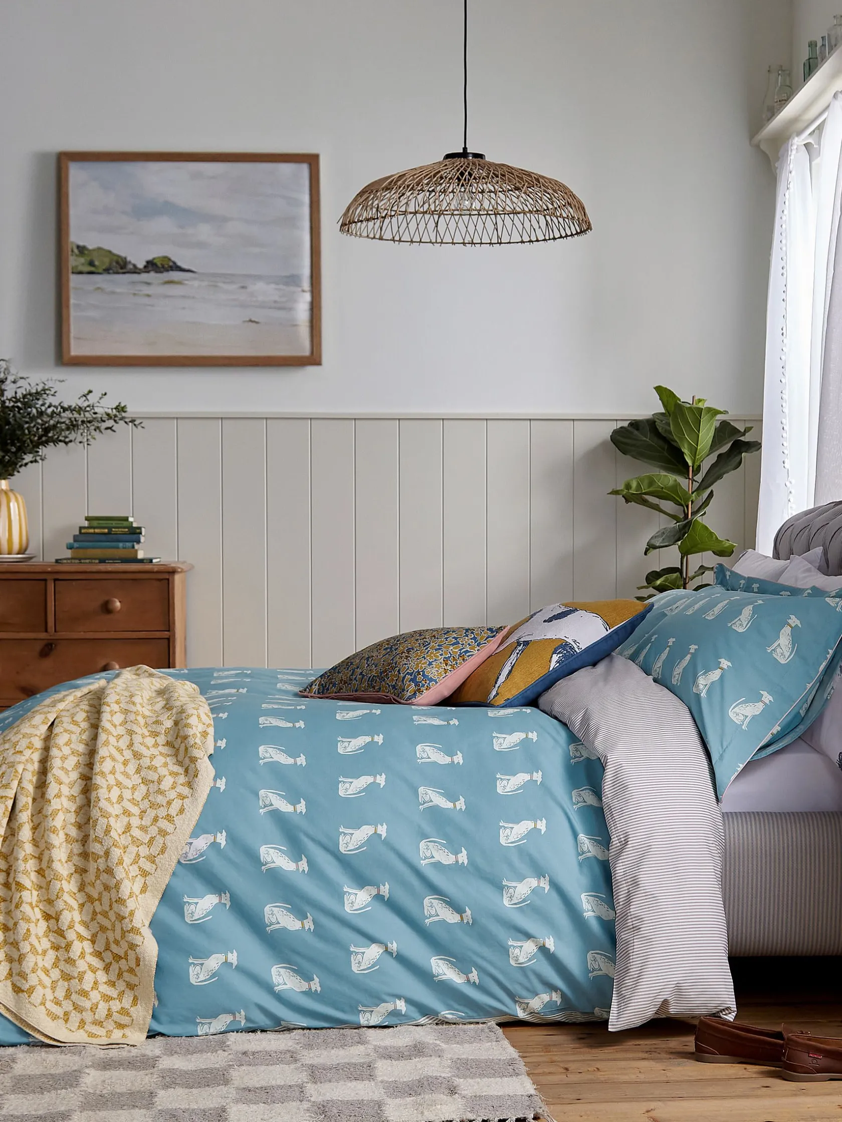 If you don’t already sleep with your four-legged friend at the end of the bed, this bedding set is the perfect way to add a little canine charm to your bedroom (without the risk of muddy paws). This playful print features an all-over block print of a curious white hound on a fresh, sky blue background. As an extra touch of charm, we’ve added a subtle pop of colour with alternating pink and gold collars on each dog. The reverse is a classic ticking stripe in crème and taupe. This set comes with two matching Oxford pillowcases with antique gold piping (single beds come with one) and can be complemented by additional standard pillowcases sold separately.