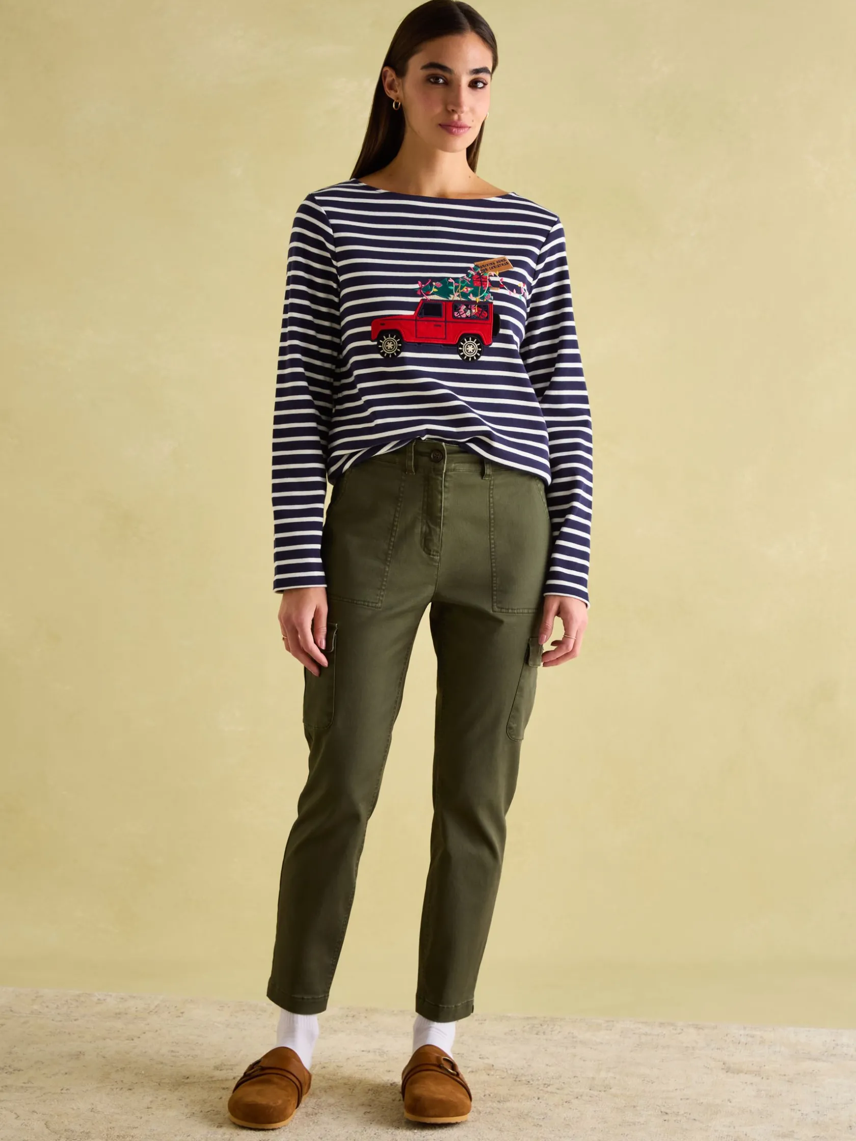 It’s a festive take on our favourite top. The fabric is a heavierweight cotton jersey that feels supremely soft to the touch, it has a relaxed fit, a wider boat neck and a shorter fit through the body. It remains distinctive through its horizontal stripes and is completed with festive design to the front. Perfect if you want to embrace seasonal dressing and still remain stylish.nnFestive design nHeavyweight cotton jerseynRelaxed fitnShorter length through the bodynWider boat necknSide ventsnStripednBranded tab to the left sleeve (as worn)
