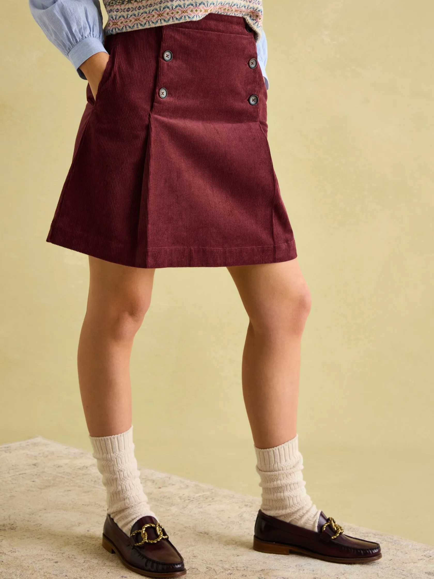 This is a skirt that will get plenty of wear. It’s cut to an a-line shape, sits just above the knee and features a pleat design to the front. The faux horn buttons add both a functional and stylish touch, while the pockets in the side seams only enhance its practicality. A-line shape. Above-the-knee length. Pleated front. Faux horn buttons. Pockets in the side seams.