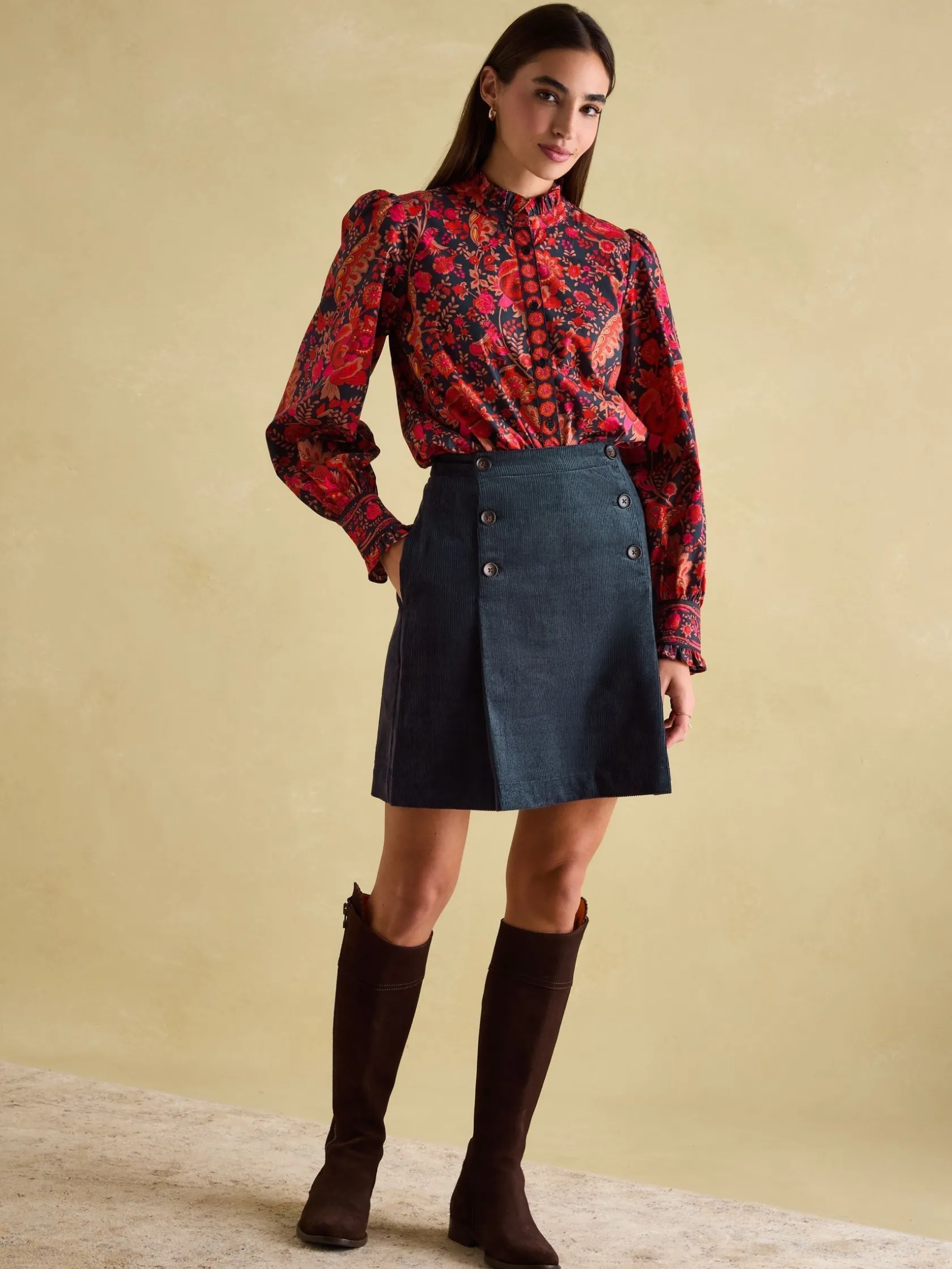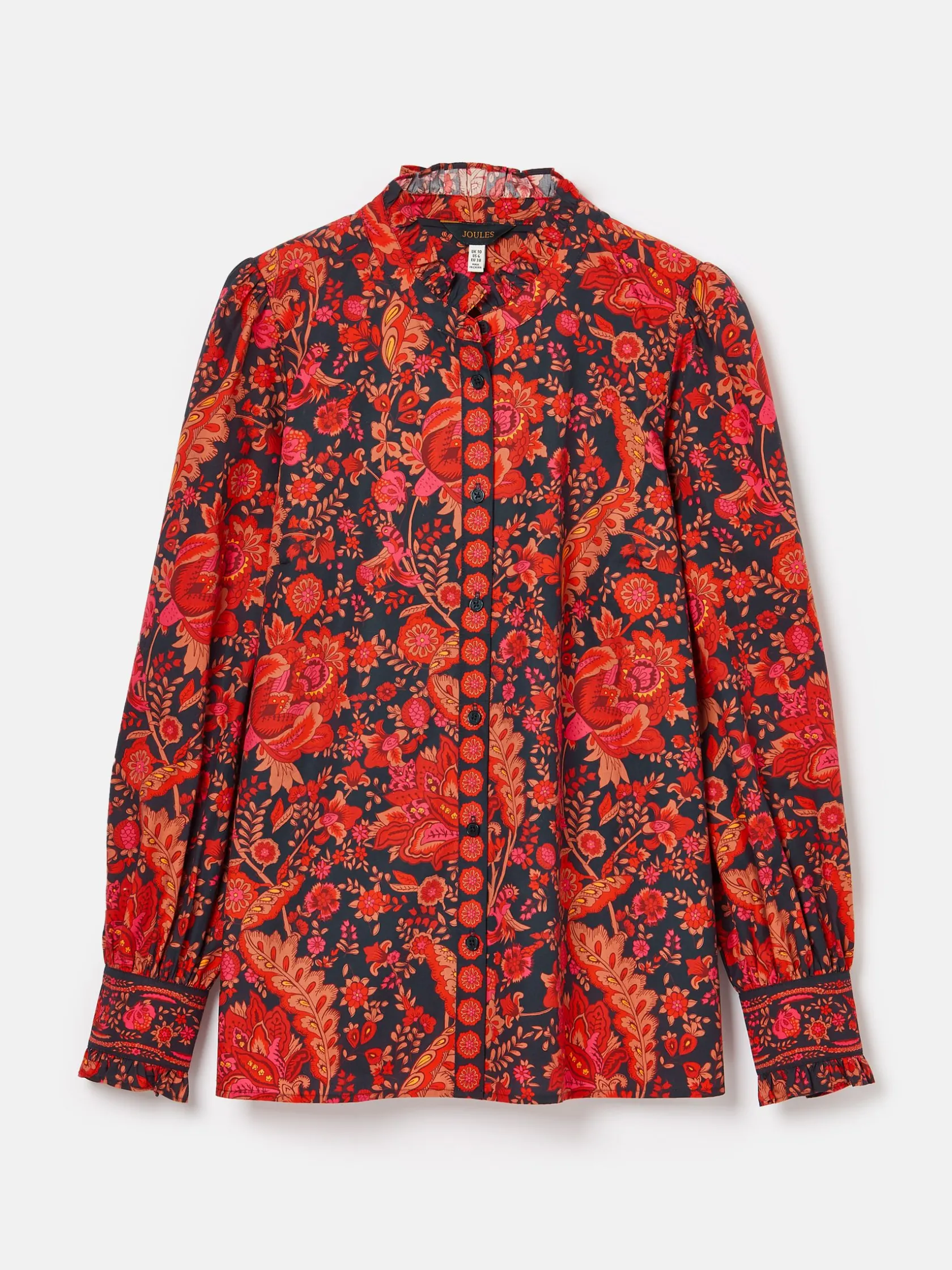 Introduce an elevated layer into your looks with the Auretta blouse. Bedecked in an ornate print which has been hand-drawn by the Joules in-house print team, it’s a piece unlike any other. It’s crafted from 100% cotton, has a classic button down fastening and a frilled neckline that will look great layered under round neck knitted vests. The sleeves are voluminous with gathered shoulders and feature button cuffs with a frilled trim. This is a style that can remain in your wardrobe year-round.100% cotton. Button down fastening. Voluminous sleeves with gathered shoulders. Button cuffs with frilled trim. Frilled neck. Hand-drawn print