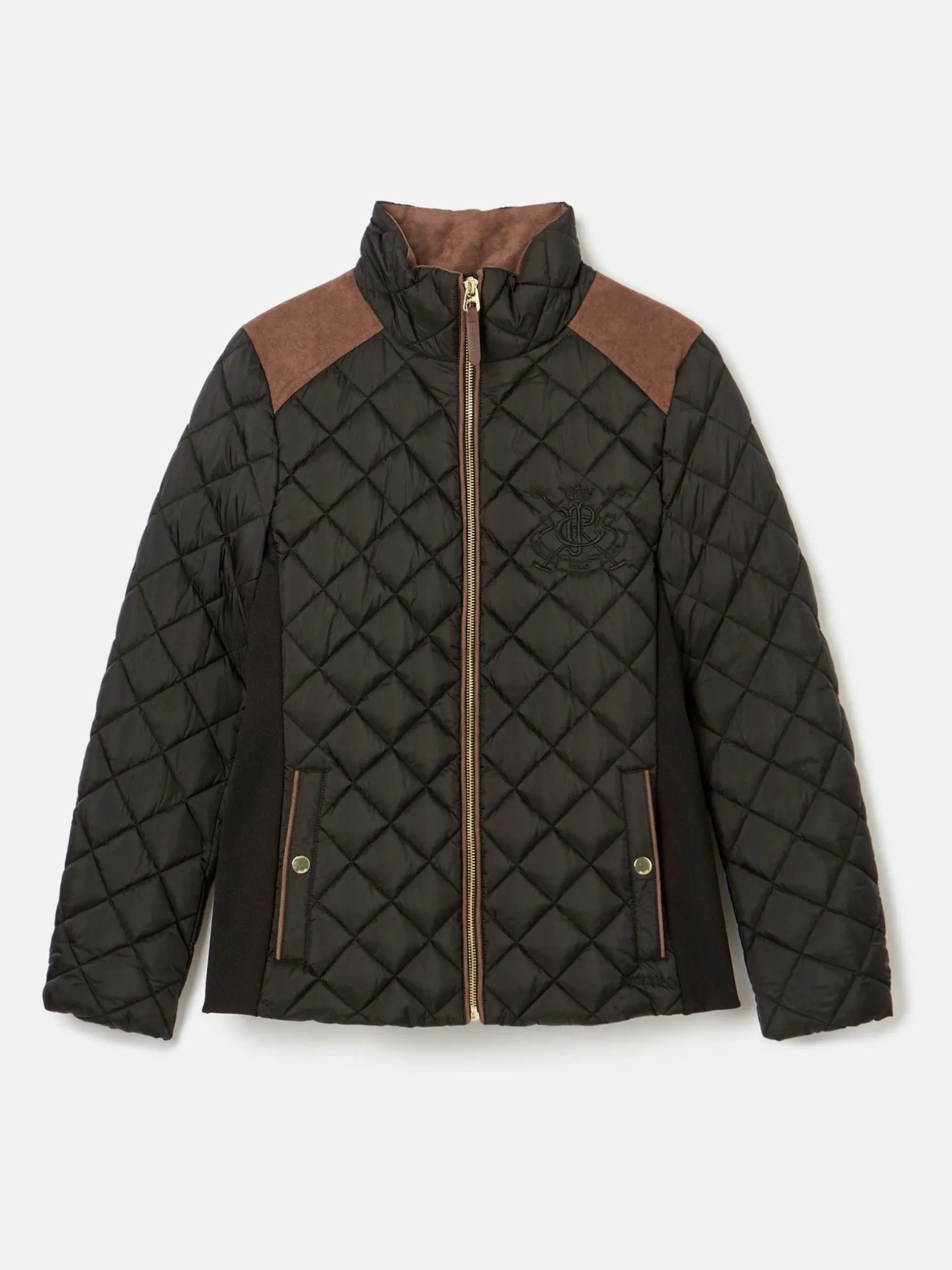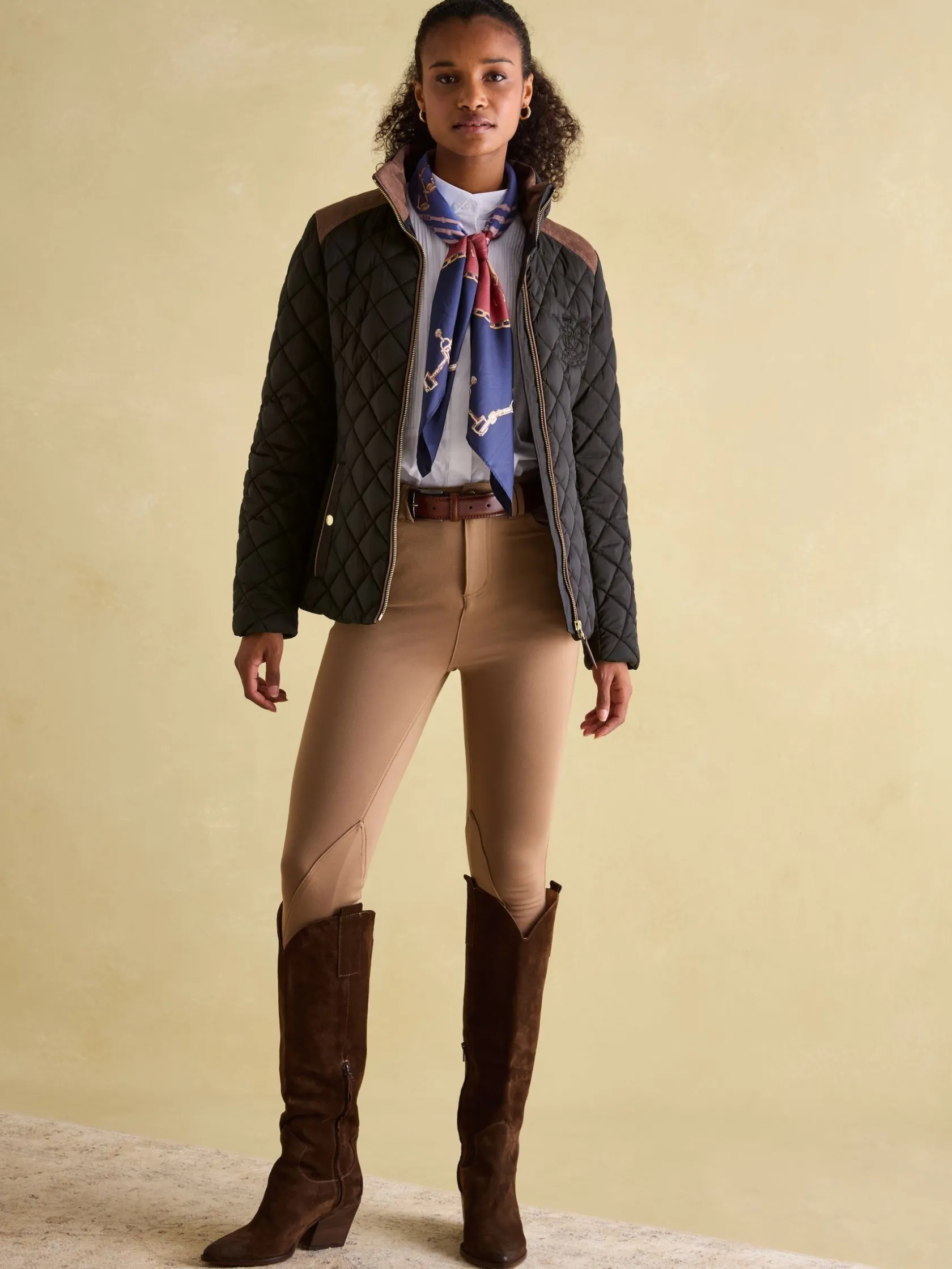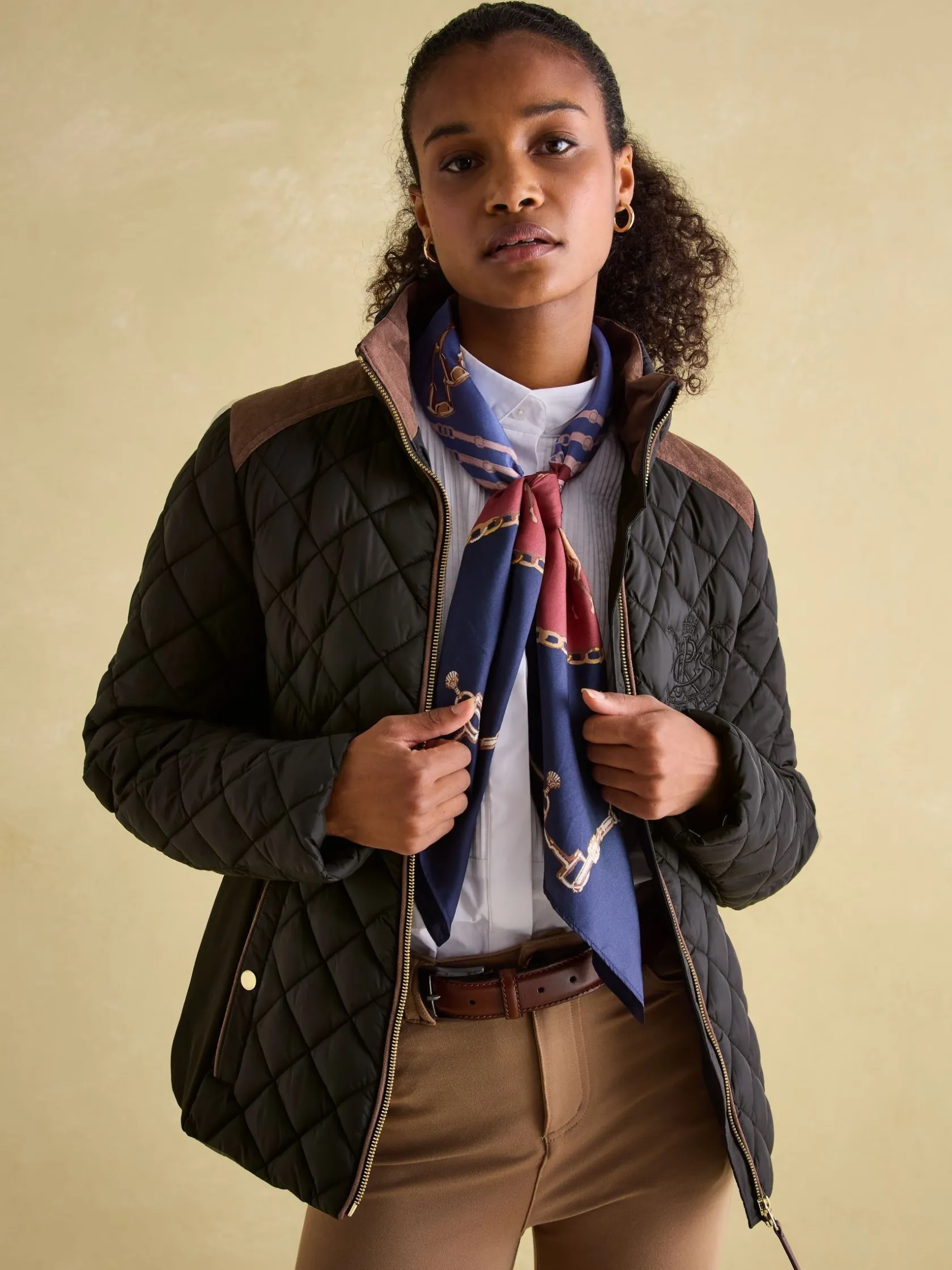 A true celebration of our rural heritage and style, this coat really does go the extra country mile. Showerproof (meaning a little rain won’t stop play) and in a traditional diamond quilt pattern, it comes in a flattering silhouette and is home to well-considered detail and functional features. Suedette details offer a little change in texture, the intricate crest embroidery is a reminder of the quality and craft and the quilted back belt is further proof that this coat is more than just a coat – it’s an expression of true countryside style. Showerproof. Diamond quilted. Funnel neck with suedette lining. Zip fastening. Suedette on shoulders. Crest embroidery. Adjustable back belt. Front pockets with popper fastenings. Curved hem with lower back