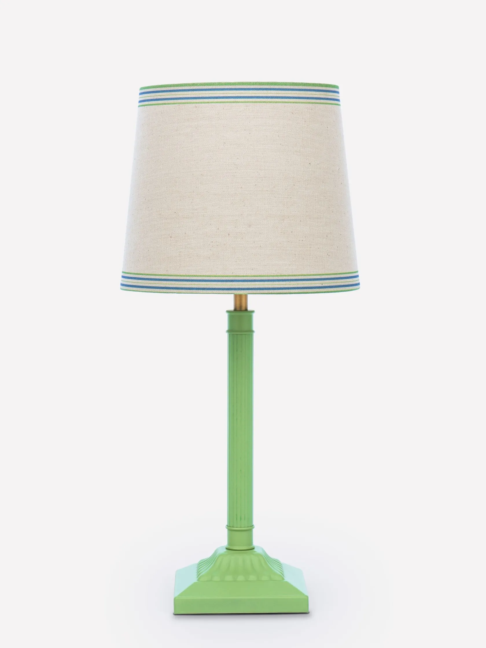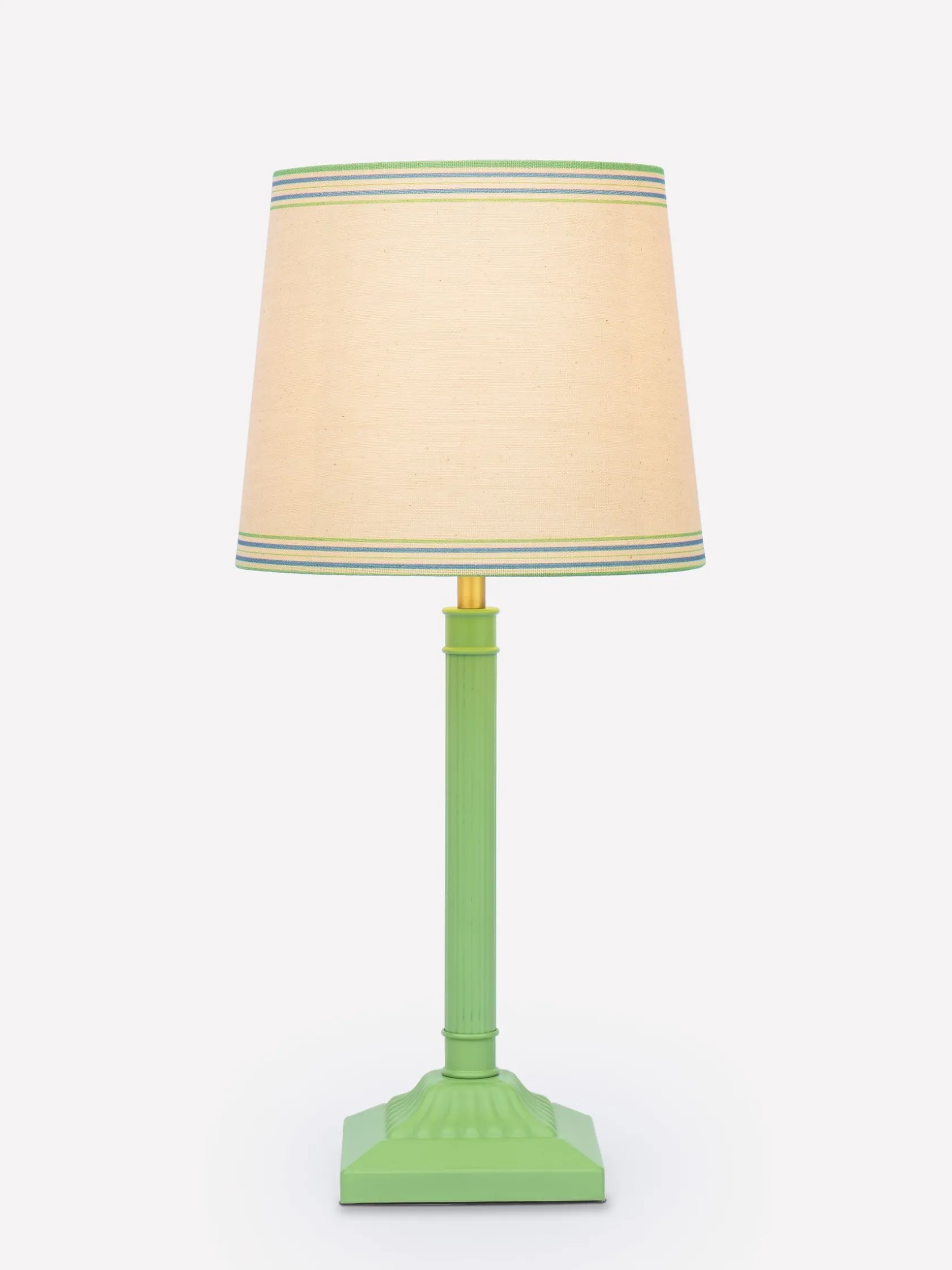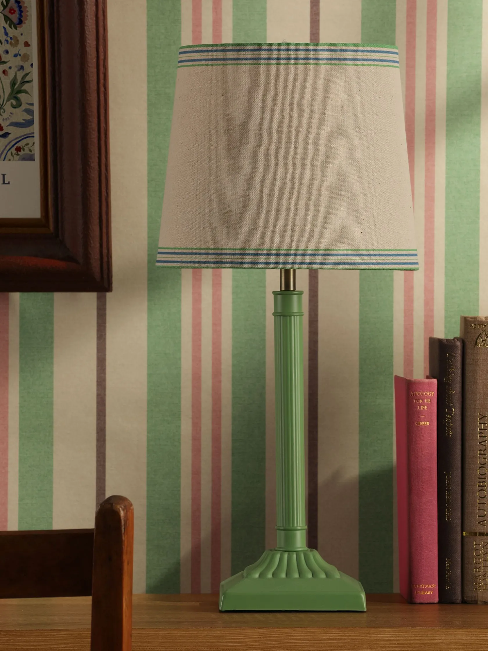 From bedside to bookcase, the Buscot table lamp will enhance any space in your home. Combining timeless style and functionality, it’s a piece that will look just as good in years to come as it does today. A decorated long column stand and square base with a green matte painted finish creates stand-out appeal. The neutral coloured linen lamp shade carries a classic tapered shape, creates a cosy glow and is trimmed with a blue striped border. Just add an early night and the latest romance bestseller. nnColumn stand with square basenDecorated matte painted basenLinen tapered lamp shade with bordernDi: 200mm x H.430mm