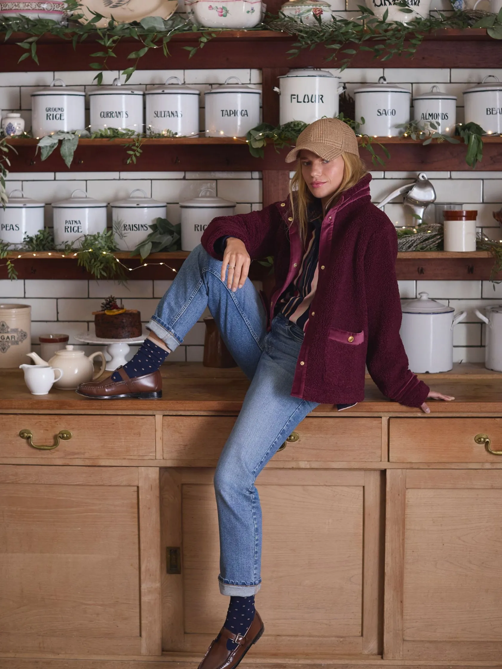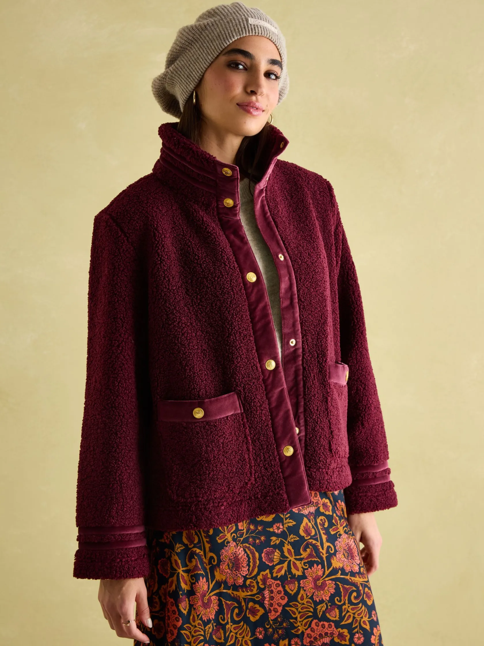 A great piece for the move into autumn, the Fleur fleece jacket will give your outfits a final layer of style. It has a boxy fit with an upstanding funnel neck for a distinctive look and its high shine gold poppers add an elevated element. Velvet trims to the neck, placket, cuffs and pocket trim makes it truly something special. Layer over anything from t-shirts and tops to knitwear for an easy everyday look you’ll love wearing. Borg fleece. Funnel neck. Boxy fit. High shine gold popper fastening. Two front pockets with popper fastenings. Velvet trim detailing to the neck, cuffs, placket and pockets.