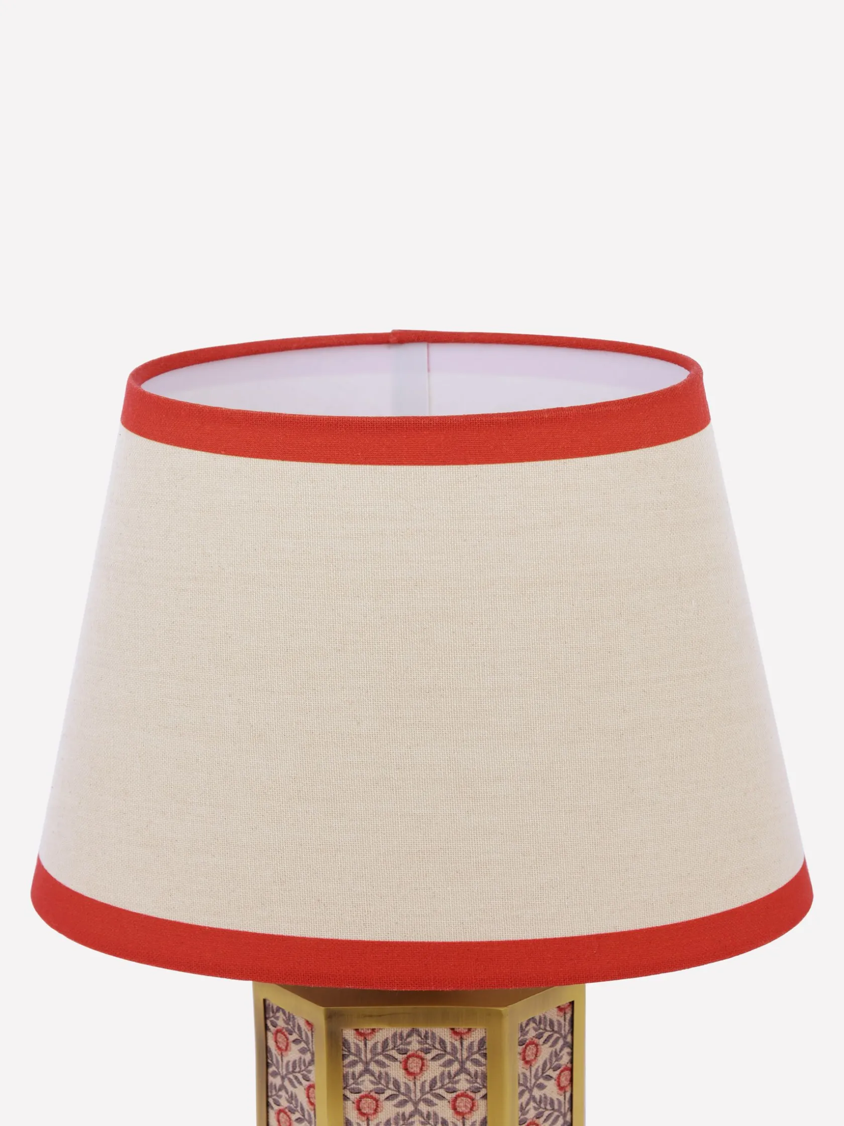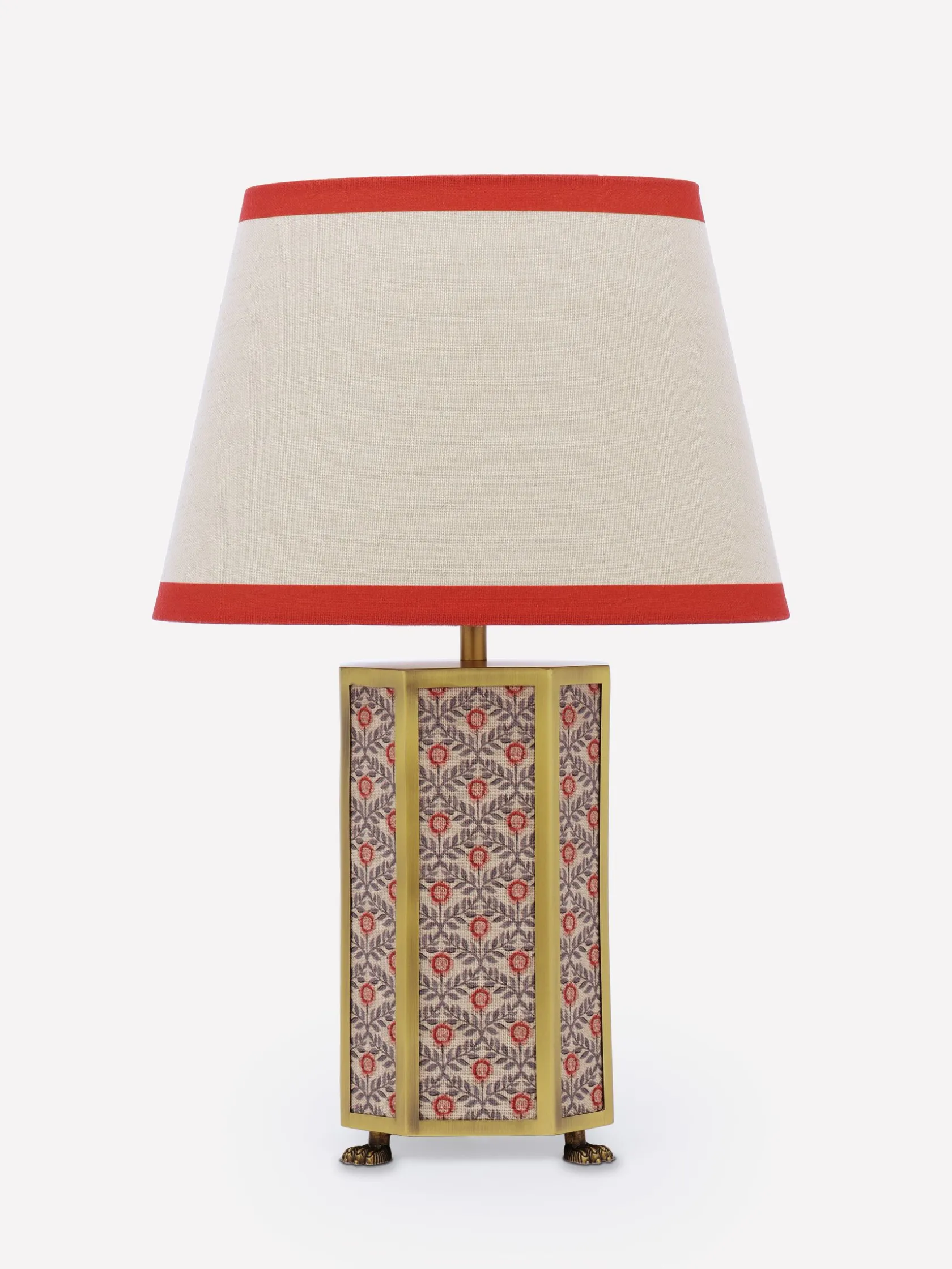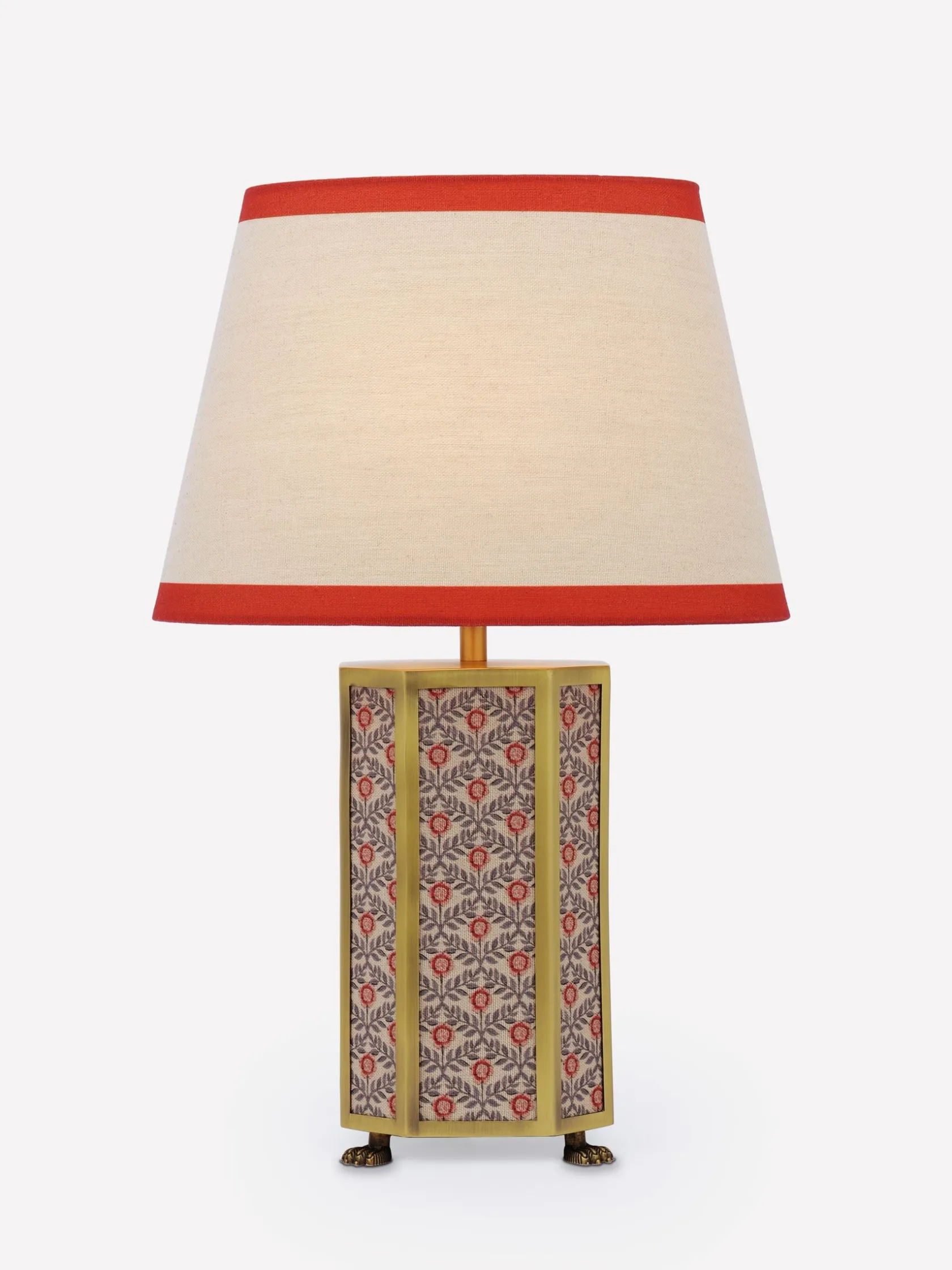 With the Helmingham table lamp creating a welcoming glow to the corners of your home, you’ll never want to turn the ‘big’ lights on again. This ornate piece combines a hexagonal matte antique brass base with printed fabric panelling and a claw foot for an opulent look that commands attention. The lamp shade has a classic tapered shape in a neutral colour and is finished with a coloured border that complements its base. Picture it nestled within a reading corner surrounded by your well-loved book collection.nnTable lampnHexagonal matte antique brass base with printed fabric panellingnClaw foot nTapered lamp shade with border nDi: 280mm x H.440mm