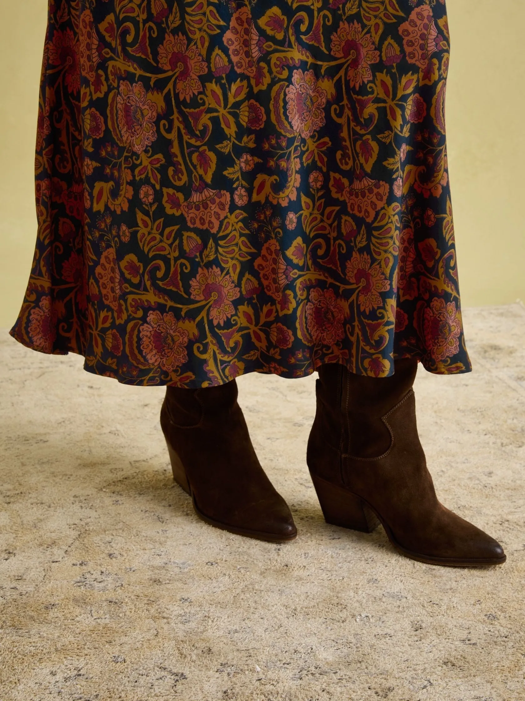 The Penelope satin skirt is guaranteed to elevate your wardrobe this season, with its equestrian-inspired print and rich colour palette. The skirt has been cut on the bias which gives it a distinctive drapey silhouette that waterfalls from the hips. Elegant and oh-so-stunning. It sits at a midi length making it great for pairing with a variety of footwear and has an invisible zip to the side for ease when getting dressed. Style with blouse for a more put-together outfit, or with a knit of your choice for a casual yet cool look. Bias cut skirt. Invisible zip to the side. Midi length. Hand-drawn print.