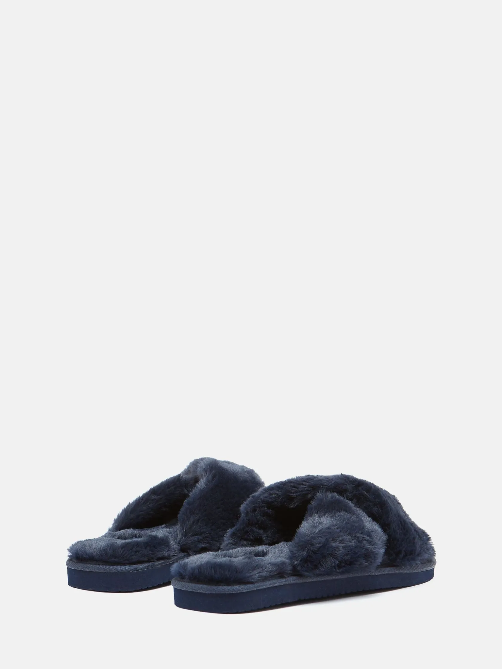 Add luxury to those at-home days with the Romilly slippers. The faux fur outer and insole ensures your foot is surrounded with softness, while the open toe, cross over design is a stylish twist. The outsole is crafted from rubber and features grippy lines so they can be worn outside on the patio too. Their rich navy colour and plush feel makes them the perfect gift for someone too. Open-toe slippers. Faux fur outer and insole. Rubber outsole with grip lines. Cross over design.