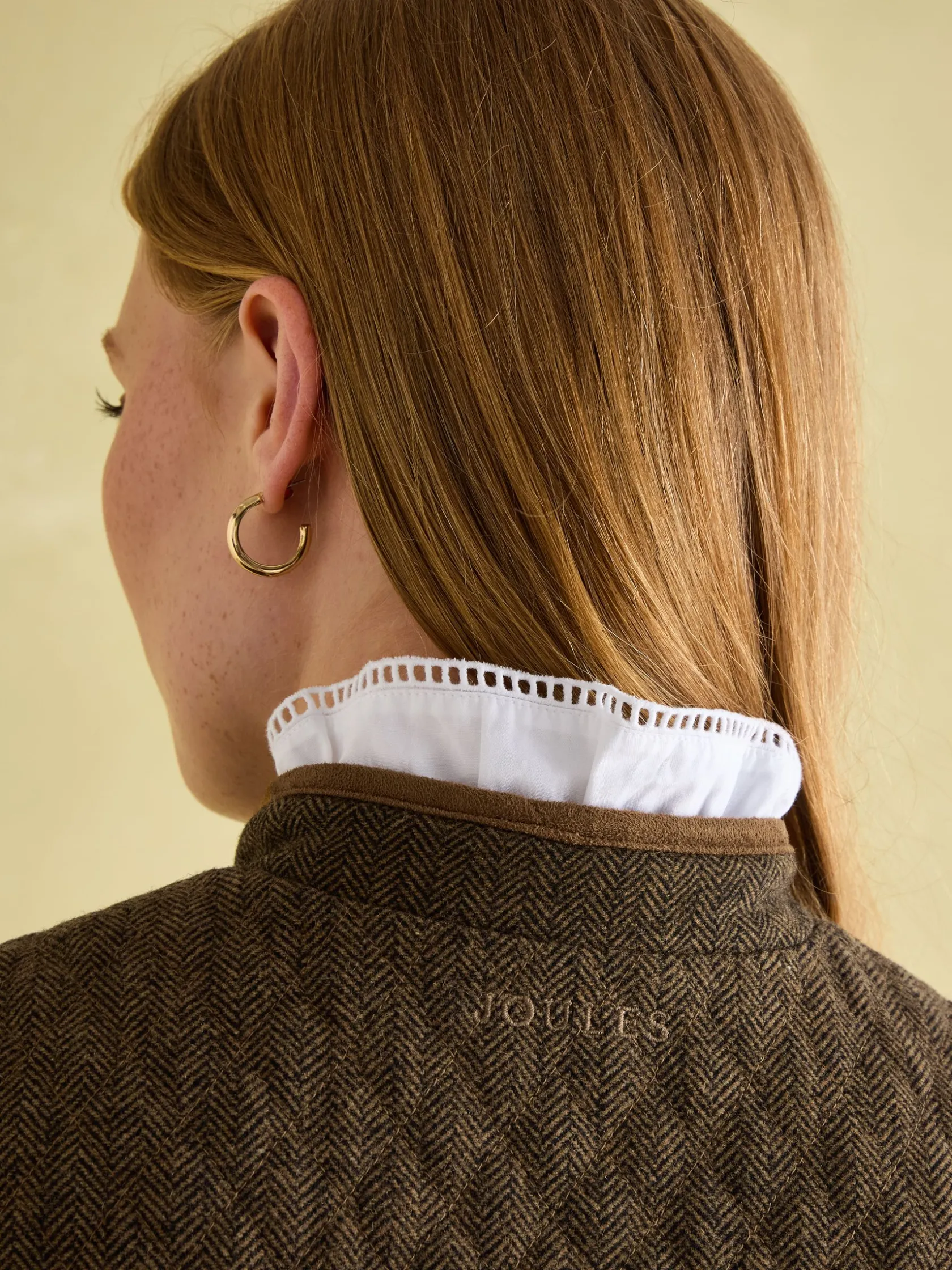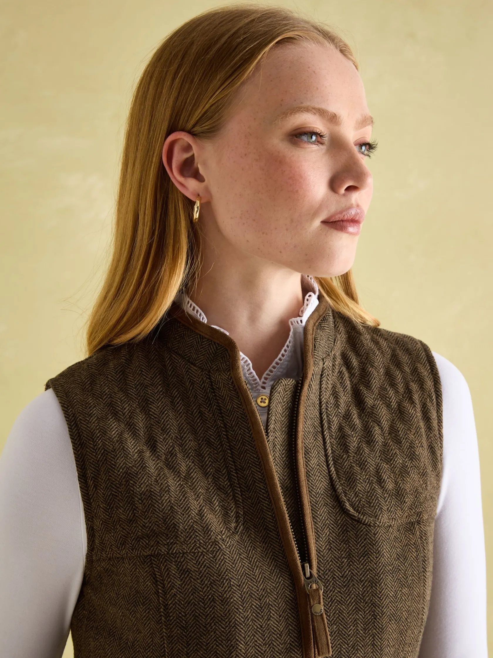 A true layer of countryside style, this tweed gilet exudes tradition and quality. Crafted from a warm and comfy wool blend tweed, it’s been finished with two shooting patch-inspired shoulders, two spacious poacher-style pockets and a suedette lining to the stand collar. The adjustable back will allow it to be cinched in for a flattering fit. The perfect piece to elevate a town-to-country look. Pair with a white shirt or blouse to take any time-off look up a notch.nnZip fasteningnQuilted shoulder patchesnSpacious pocketsnBelt to backnSuedette detailsnLightly quilted for warmnAdjustable back feature for a cinched in a flattering fitnPrinted lining
