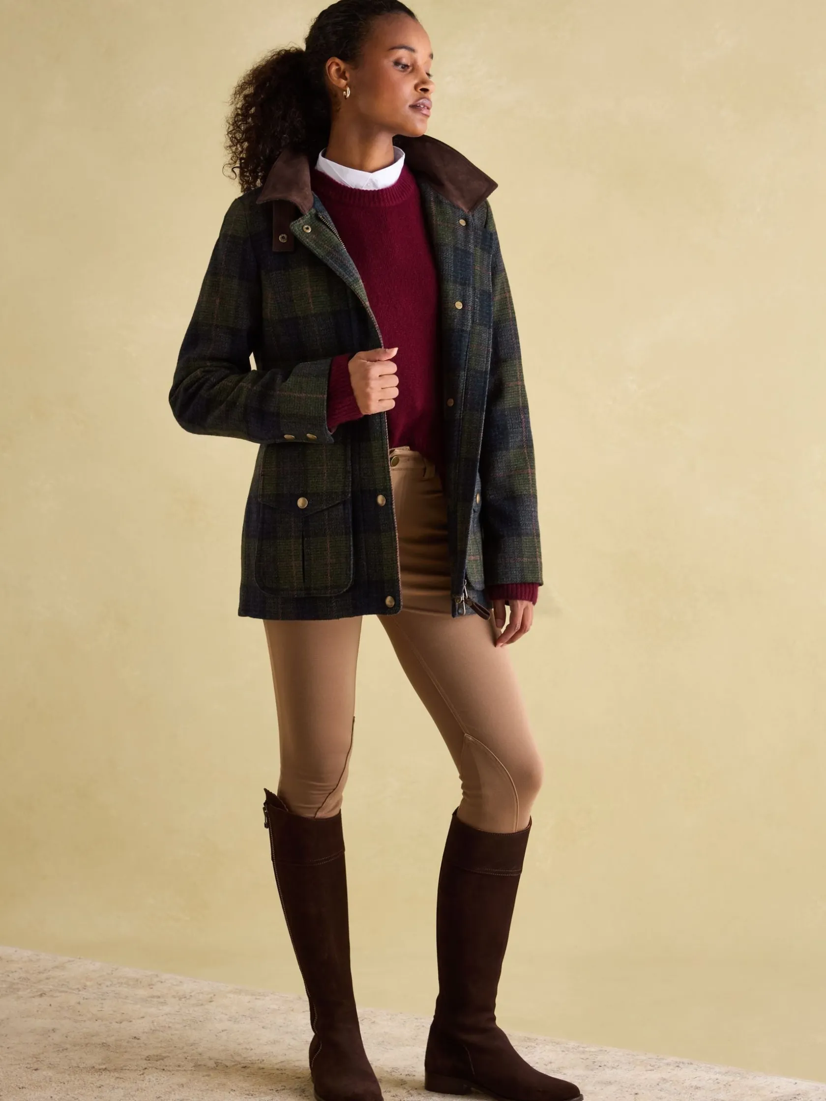 Our best-loved Fieldcoat is a style that we love to get reacquainted with every year. It’s crafted from a wool-blend that’s been adorned with an in-house designed check. It features a zip and popper fastening, suedette detailing and brass trims. The collar has been designed to be worn up or down and we’ve added to large pockets to the front. Inside you’ll find a printed lining and an internal pocket. Perfect for wearing on country walks or when dashing into town. A true investment piece.nnFieldcoatnWool blendnFlattering shapenSuedette detailnButton and zip fasteningnPocketsnPrinted lining