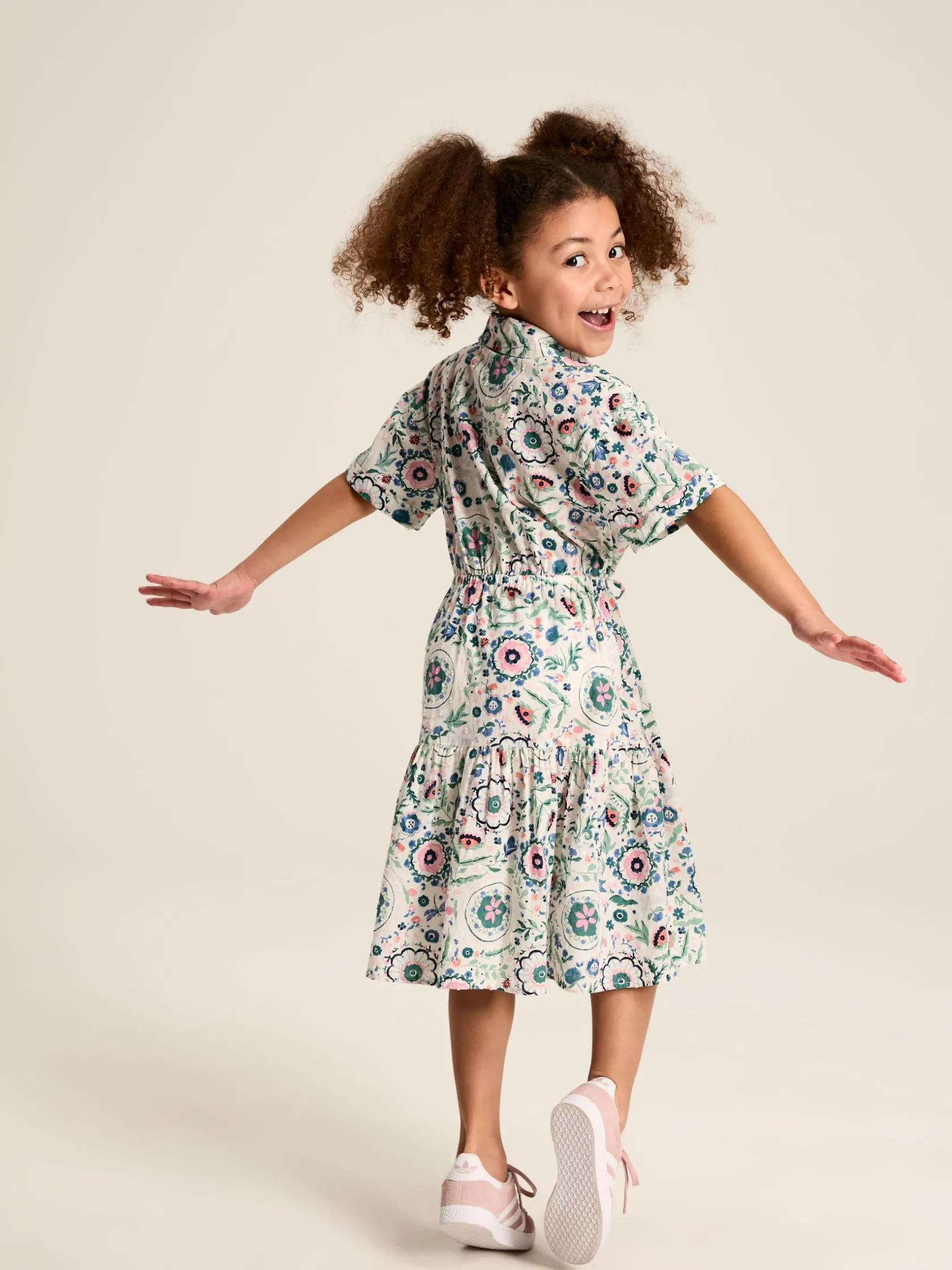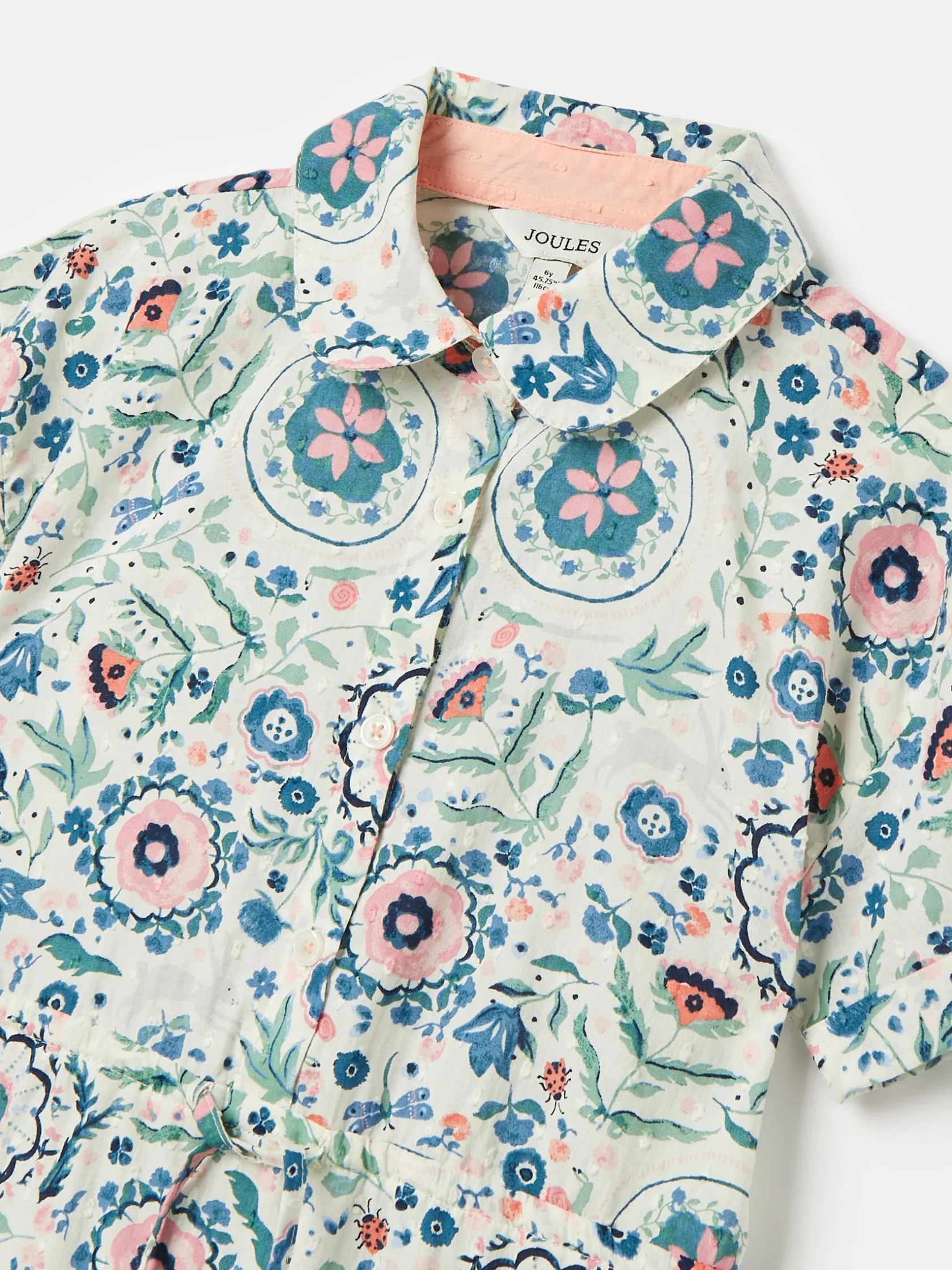 From tea parties to garden games, this pretty short-sleeved shirt dress is made for days filled with sunshine and smiles. The lightweight cotton fabric has a textured feel for that touch of something special, and the beautiful nature-inspired print will have them head over heels. It has a Peter Pan collar with a button-down front, and a pull-tie waistband that fastens in a bow at the front. The skirt has two pretty gathered tiers that are perfect for twirling in. 100% cotton textured fabric. Short sleeves. Peter Pan collar. Button-down front. Functional tie waist. Tiered skirt with gathers.
