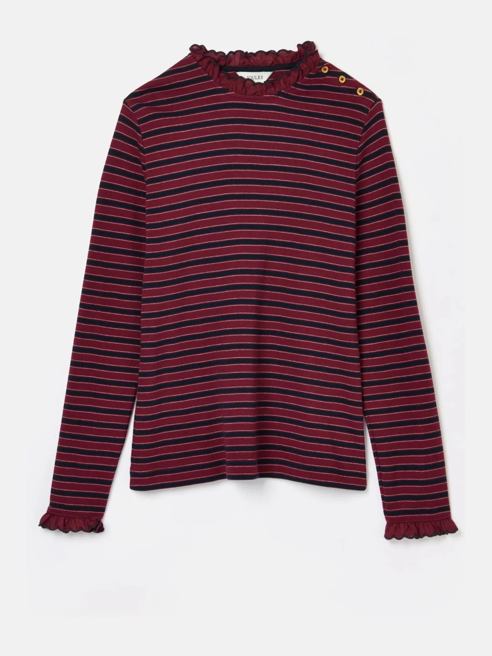 Build on your autumn layers with the Grace jersey top. With a slim fit, it acts as the perfect ‘first’ layer under knits and sweatshirts. It’s crafted from supremely soft jersey, has long sleeves and a frilled neck and cuffs. Buttons to the shoulders and an all-over stripe ensures it remains a stand-out style when worn alone with jeans in fairer weather too. 100% cotton jersey. Slim fit. Long sleeves with frilled cuffs. Buttons to the shoulders. Frilled neck.