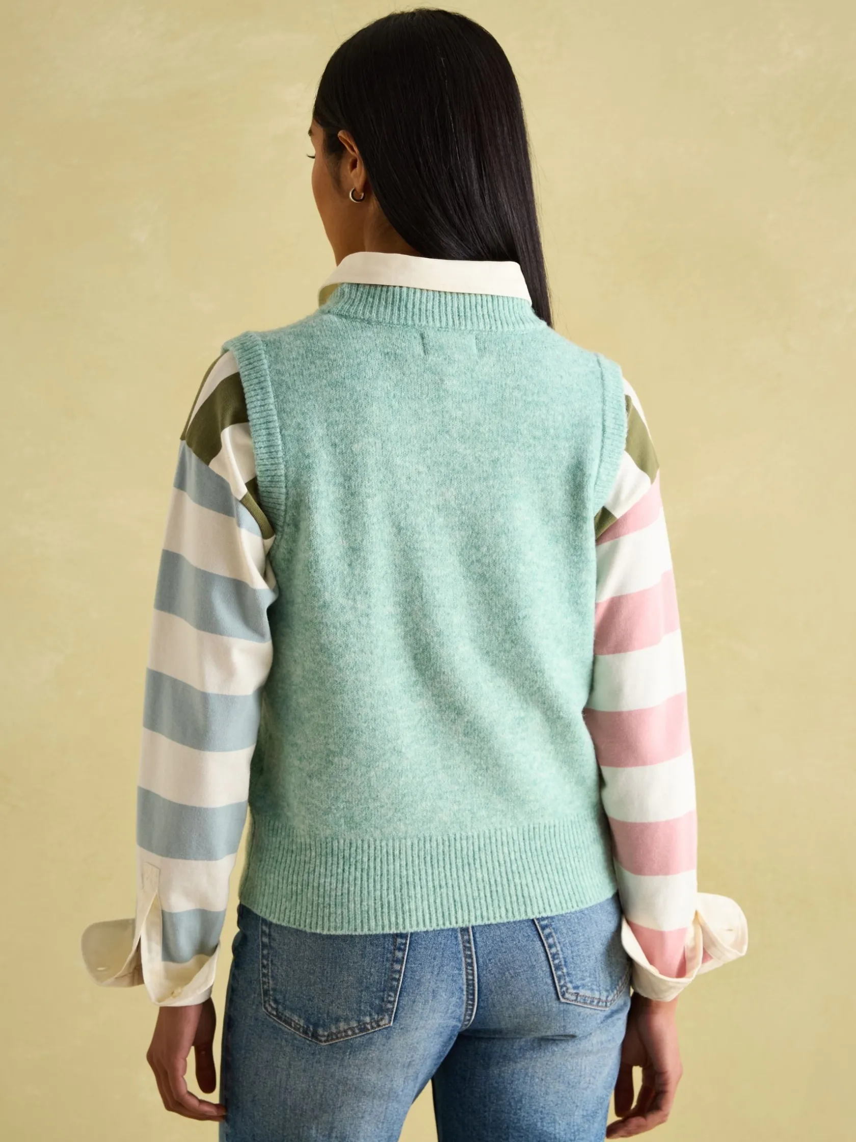 A knit you can wear now and later, the Holly vest is a versatile style to own. In milder weather style alone with chino or denim shorts and when temperatures drop, layer over a ruffle neck blouse of slim-fit top. It comes in an array of colours to choose from and is finished with a ribbed neck, hem and armholes. Knitted. Sleeveless. Regular fit. Ribbed neck. Ribbed hem. Ribbed armholes.
